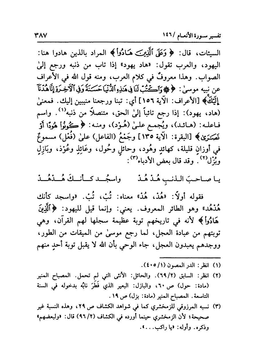 السيئات، قال: {وَعَلَى الَّذِينَ هَادُواْ} المراد بالذين هادوا هنا: اليهود، والعرب تقول: «هاد يهود» إذا تَابَ مِنْ ذَنْبِهِ ورجع إلى الصواب، وهذا معروفٌ في كلام العرب، ومنه قول الله في الأعراف عن نبيه موسى: {وَاكْتُبْ لَنَا فِي هَذِهِ الدُّنْيَا حَسَنَةً وَفِي الآخِرَةِ إِنَّا هُدْنَا إِلَيْكَ} [الأعراف: الآية ١٥٦] أي: تبنا ورجَعْنَا منيبِين إليك. فمعنى (هاد، يهود): إذا رجع تائباً إلى الحق، مُتَنَصِّلاً مِنْ ذَنْبِه (¬١)، واسم فاعله: (هائد)، ويُجمع على (هُوْد)، ومنه: {كُونُواْ هُوداً أَوْ نَصَارَى} [البقرة: الآية ١٣٥] وجَمْعُ (الفاعل) على (فُعْل) مسموعٌ في أوزانٍ قليلة، كهائدٍ وهُود، وحائلٍ وحُول، وعَائِذٍ وعُوْذ، وبَازِلٍ وبُزْل (¬٢). وقد قال بعض الأدباء (¬٣):