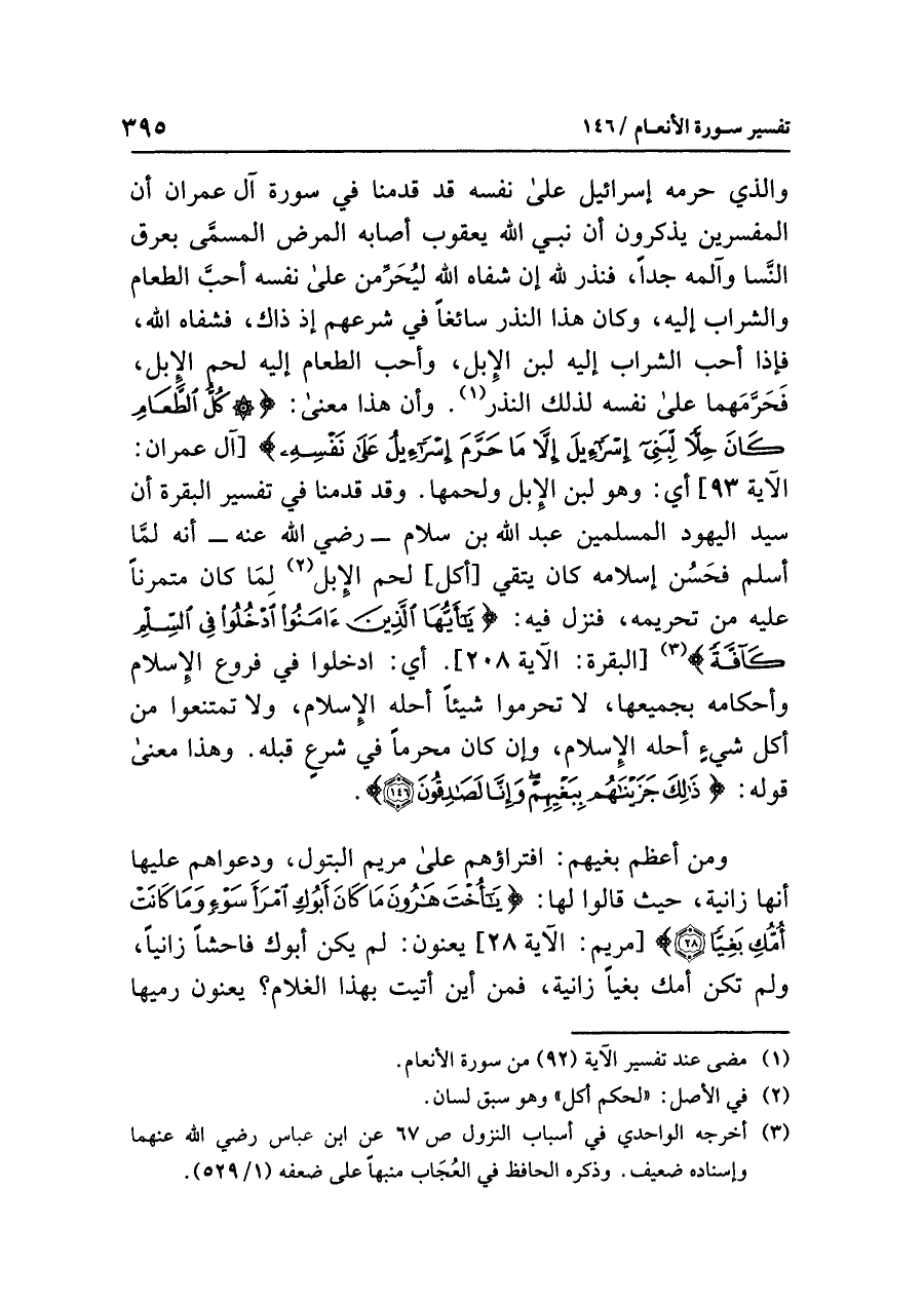 وأن هذا معنى: {كُلُّ الطَّعَامِ كَانَ حِلاًّ لِّبَنِي إِسْرَائِيلَ إِلَّا مَا حَرَّمَ إِسْرَائِيلُ عَلَى نَفْسِهِ} [آل عمران: الآية ٩٣] أي: وهو لبن الإبل ولحمها، وقد قدمنا في تفسير البقرة أن سيد اليهود المسلمين عبد الله بن سلام -رضي الله عنه- أنه لمَّا أسلم فحَسُن إسلامه كان يتقي [أكل] لحم الإبل (¬٢) لِمَا كان متمرناً عليه من تحريمِهِ، فنزل فيه: {يَا أَيُّهَا الَّذِينَ آمَنُواْ ادْخُلُواْ فِي السِّلْمِ كَآفَّةً} (¬٣) [البقرة: الآية ٢٠٨]. أي: ادخلوا في فُرُوعِ الإسلام وأحكامه بجميعها، لا تحرِّمُوا شيئاً أحَلَّهُ الإِسْلَام، ولا تَمْتَنِعُوا مِنْ أكْلِ شيء أحله الإسلام، وإن كان محرَّماً في شرع قَبْلَهُ، وهذا معنى قوله: {ذَلِكَ جَزَيْنَاهُم بِبَغْيِهِمْ وِإِنَّا لَصَادِقُونَ}.