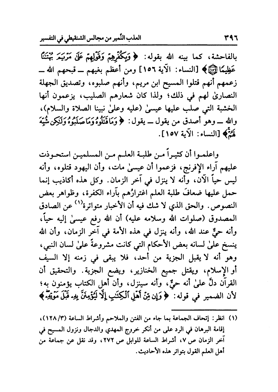 واعلموا أن كثيراً مِنْ طَلَبَةِ العِلْمِ مِنَ المسلمين استحْوَذَتْ عليهم آراء الإفرنج، فزَعموا أن عيسى مات، وأن اليهود قَتَلُوه، وأنه ليس حيّاً الآن، وأنه لا يَنْزِلُ فِي آخِرِ الزَّمَانِ، وكل هذه أكاذيب إنما حمل عليها ضعافَ طلبة العلم اغترارُهم بآراء الكفرة، وظواهر بعض النصوص، والحق الذي لا شَكَّ فِيهِ أن الأخبار متواترة (¬١)