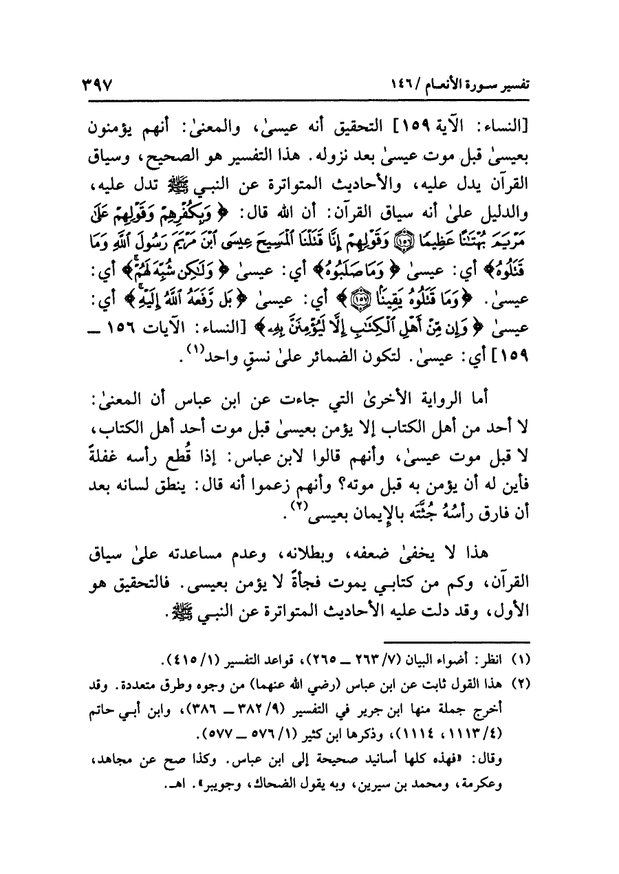 [النساء: الآية ١٥٩] التحقيق أنه عيسى، والمعنى: أنهم يؤمنون بعيسى قبل موت عيسى بعد نزوله، هذا التفسير هو الصحيح، وسياق القرآن يدل عليه، والأحاديث المتواترة عن النبي - صلى الله عليه وسلم - تَدُلّ عليه، والدليل على أنه سياق القرآن: أن الله قال: {وَبِكُفْرِهِمْ وَقَوْلِهِمْ عَلَى مَرْيَمَ بُهْتَاناً عَظِيماً (١٥٦) وَقَوْلِهِمْ إِنَّا قَتَلْنَا المَسِيحَ عِيسَى ابْنَ مَرْيَمَ رَسُولَ اللهِ وَمَا قَتَلُوهُ} أي: عيسى {وَمَا صَلَبُوهُ} أي: عيسى {وَلَكِن شُبِّهَ لَهُمْ} أي: عيسى {وَمَا قَتَلُوهُ يَقِيناً} أي: عيسى {بَل رَّفَعَهُ اللهُ إِلَيْهِ} أي: عيسى {وَإِن مِّنْ أَهْلِ الْكِتَابِ إِلَّا لَيُؤْمِنَنَّ بِهِ} [النساء: الآيات ١٥٦ - ١٥٩] أي: عيسى، لتكون الضمائر على نسقٍ واحد (¬١).