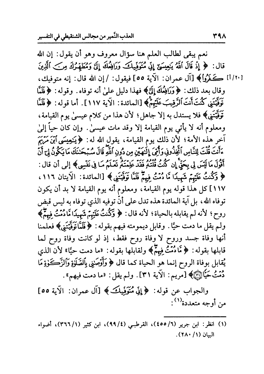 [٢٠/أ] نعم يبقى لطالب العلم هنا سؤال معروف وهو أن يقول:/ إن الله قال: {إِذْ قَالَ اللهُ يَا عِيسَى إِنِّي مُتَوَفِّيكَ وَرَافِعُكَ إِلَيَّ وَمُطَهِّرُكَ مِنَ الَّذِينَ كَفَرُواْ} [آل عمران: الآية ٥٥] فيقول: إن الله قال: إنه مُتَوَفِّيك، وقال بعد ذلك: {وَرَافِعُكَ إِلَيَّ} فهذا دليل على أنه توفاه، وقوله: {فَلَمَّا تَوَفَّيْتَنِي كُنتَ أَنتَ الرَّقِيبَ عَلَيْهِمْ} [المائدة: الآية ١١٧]. أما قوله: {فَلَمَّا تَوَفَّيْتَنِي} فلا يستدل به إلا جاهل؛ لأن هذا من كلام عيسى يوم القيامة، ومعلوم أنه لا يأتي يوم القيامة إلا وقد مات عيسى، وإن كان حيّاً إلى آخر هذه الأمة؛ لأن ذلك يوم القيامة، يقول الله له: {يَا عِيسَى ابْنَ مَرْيَمَ أَأَنتَ قُلتَ لِلنَّاسِ اتَّخِذُونِي وَأُمِّيَ إِلَهَيْنِ مِن دُونِ اللهِ قَالَ سُبْحَانَكَ مَا يَكُونُ لِي أَنْ أَقُولَ مَا لَيْسَ لِي بِحَقٍّ إِن كُنتُ قُلْتُهُ فَقَدْ عَلِمْتَهُ تَعْلَمُ مَا فِي نَفْسِي} إلى أن قال: {وَكُنتُ عَلَيْهِمْ شَهِيداً مَّا دُمْتُ فِيهِمْ فَلَمَّا تَوَفَّيْتَنِي} [المائدة: الآيتان ١١٦، ١١٧] كل هذا قوله يوم القيامة، ومعلوم أنه يوم القيامة لا بد أن يكون تَوَفَّاهُ الله، بَل آية المائدة هذه تدل على أنّ توفيه الذي توفاه به ليس قبض روح؛ لأنه لم يقابله بالحياة؛ لأنه قال: {وَكُنتُ عَلَيْهِمْ شَهِيداً مَّا دُمْتُ فِيهِمْ} ولم يقل ما دمت حيًّا، وقابل ديمومته فيهم بقوله: {فَلَمَّا تَوَفَّيْتَنِي} فَعَلِمْنَا أنها وفاة جسد وروح لا وفاة روح فقط، إذ لو كانت وفاة روح لما قابلها بقوله: {مَّا دُمْتُ فِيهِمْ} ولقابلها بقوله: «ما دمت حيًّا»؛ لأن الذي يُقابل بوفاة الروح إنما هو الحياة كما قال: {وَأَوْصَانِي بِالصَّلَاةِ وَالزَّكَاةِ مَا دُمْتُ حَيّاً} [مريم: الآية ٣١] ولم يقل: ما دمت فيهم.