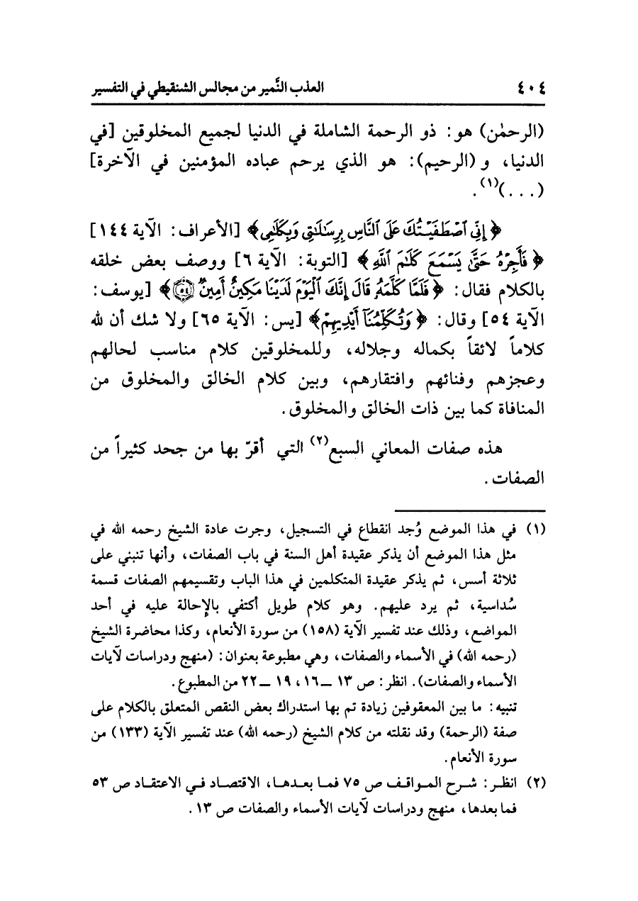 (¬١) في هذا الموضع وُجد انقطاع في التسجيل، وجرت عادة الشيخ رحمه الله في مثل هذا الموضع أن يذكر عقيدة أهل السنة في باب الصفات، وأنها تنبني على ثلاثة أسس، ثم يذكر عقيدة المُتَكَلِّمِينَ في هذا الباب وتقسيمهم الصفات قسمة سُداسية، ثم يرد عليهم، وهو كلام طويل أكتفي بالإحالة عليه في أحد المواضع، وذلك عند تفسير الآية (١٥٨) من سورة الأنعام، وكذا محاضرة الشيخ (رحمه الله) في الأسماء والصفات، وهي مطبوعة بعنوان: (منهج ودراسات لآيات الأسماء والصفات). انظر ص ١٣ - ١٦، ١٩ - ٢٢ من المطبوع.