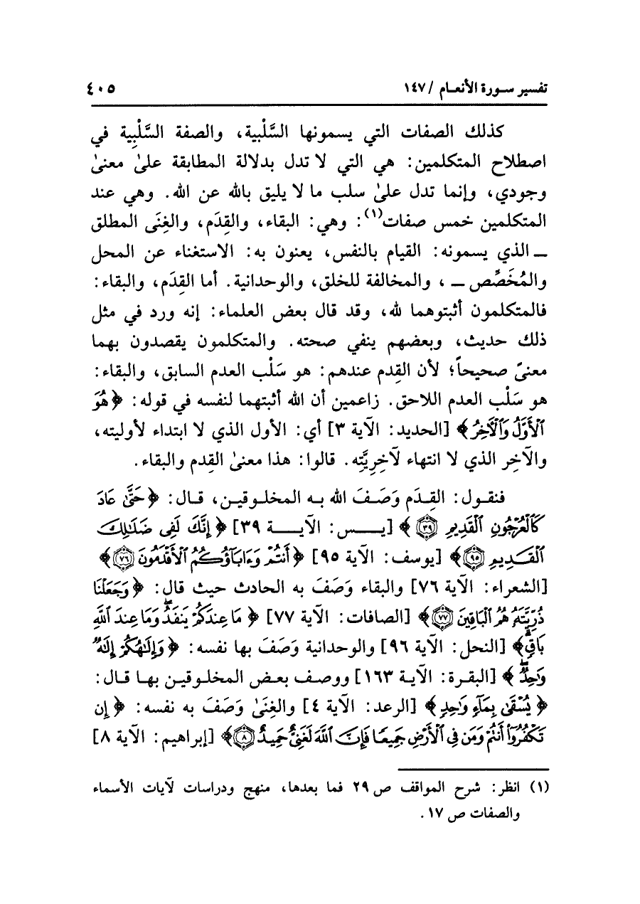 كذلك الصفات التي يسمونها السَّلْبية، والصفة السَّلْبِية في اصطلاح المتكلمين: هي التي لا تدل بدلالة المطابقة على معنى وجودِيٍّ، وإنما تدل على سَلْبِ ما لا يليق بالله عن الله، وهي عند المتكلمين خمس صفات (¬١)، وهي: البقاء، والقِدَم، والغِنَى المطلق- الذي يسمونه: القيام بالنفس، يعنون به: الاستغناء عن المحل والمُخَصَّص- والمخالفة للخلق، والوحدانية. أما القِدَم والبقاء: فالمتكلمون أثبتوهما لله، وقد قال بعض العلماء: إنه ورد في مثل ذلك حديث، وبعضهم ينفي صِحَّتَهُ، والمتكلمون يقصدون بهما معنىً صحيحاً؛ لأن القِدَمَ عِنْدَهُمْ: هو سَلْبُ الْعَدَمِ السَّابِقِ، والبقاء: هو سَلْب العدم اللاحق، زَاعِمِينَ أن الله أثبتهما لِنَفْسِهِ في قوله: {هُوَ الْأَوَّلُ وَالْآخِرُ} [الحديد: الآية ٣] أي: الأول الذي لا ابتداء لأوَّلِيَّتِهِ، والآخِر الذي لا انتهاء لآخِرِيَّتِه. قالوا: هذا معنى القِدَمِ والْبَقَاءِ.