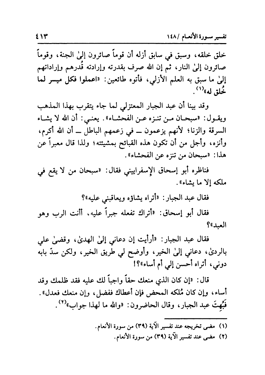 وقَدْ بَيَّنَّا أنَّ عَبْدَ الجَبَّارِ المعتزلي لما جاء يَتَقَرَّب بهذا المذهب ويقول: «سبحان من تنزه عن الفحْشَاء!» يعني: أن الله لا يشاء السرقة والزنا؛ لأنهم يزعمون -في زَعْمِهِمُ البَاطِل- أن الله أكرم وأنْزَه وأجَلّ من أن تكون هذه القبائح بمشيئته؛ ولذا قال مُعَبِّراً عن هذا: «سبحان مَنْ تَنَزَّهَ عَنِ الفَحْشَاءِ!».