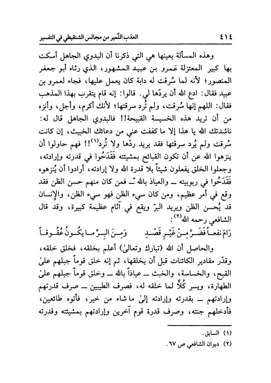 وهذه المَسْأَلة بعينها هي التي ذكرنا أن البَدَوِيَّ الجاهل أسكت بها كبير المعتزلة عَمْرو بن عبيد المشهور الذي رثاه أبو جعفر المنصور؛ لأنه لما سُرقت له دَابَّة كان يعمل عليها، فجاء لعمرو بن عبيد فقال: ادع الله أن يردّها لي. قالوا: إنه قَامَ يَتَقَرَّبُ بهذا المذهب فقال: اللهُمَّ إِنَّها سُرقت، ولم تُرد سَرِقَتَها؛ لأنك أكْرَم وأجلّ وأَنْزه من أن تريد هذه الخسيسة القَبِيحَةَ! فالبدوي الجاهل قال له: نَاشَدْتُكَ الله يا هذا إلا ما كَفَفْتَ عني من دعائك الخبيث، إن كانت سُرقت ولم يُرِدْ سَرِقَتَها فقد يريد ردّها ولا تُرَدّ (¬١)! فهم حاولوا أن يُنَزِّهُوا الله عن أن تكون القبائح بمشيئته فَقَدَحُوا في قُدْرَتِهِ وإرَادَتِهِ، وجعلوا الخلق يفعلون شيئاً بلا قدرة الله ولا إرادته، أرادوا أن يُنَزِّهُوه فَقَدَحُوا في ربوبيته -والعياذ بالله- فمن كان منهم حسن الظن فقد وقع في أمر عظيم، ومن كان سيِّئَ الظن فهو سيِّئُ الظن، والإنسان قد يُحسن الظن ويريد البرّ ويقع في آثام عظيمة كبيرة، وقد قال الشافعي رحمه الله (¬٢):