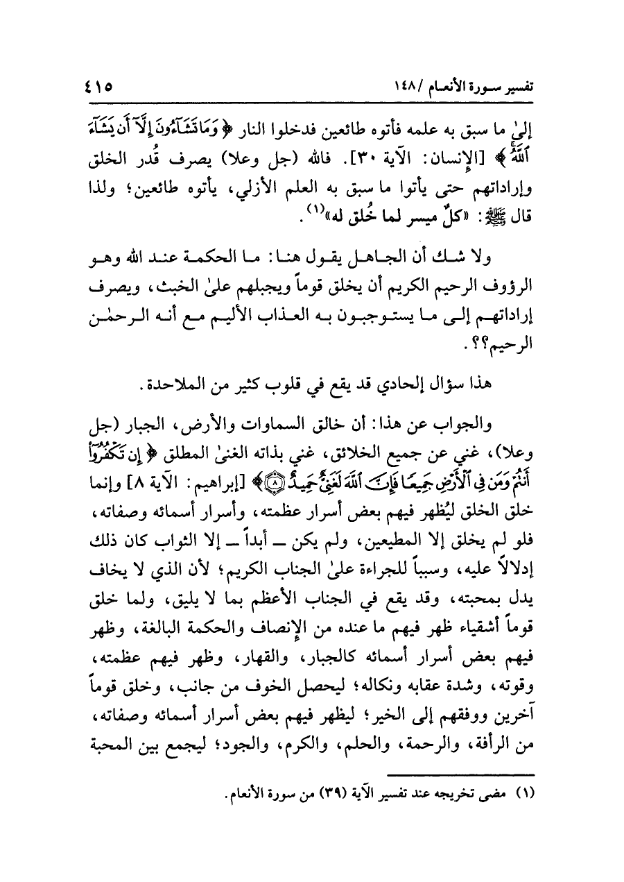 إلى ما سبق به علمه فأتَوْهُ طائعين فدخلوا النار {وَمَا تَشَاءُونَ إِلَّا أَن يَشَاءَ اللهُ} [الإنسان: الآية٣٠] فالله (جل وعلا) يَصْرِفُ قُدر الخلق وإراداتهم حتى يأتوا ما سبق به العلم الأزلي، يأتوه طائعين؛ ولذا قال - صلى الله عليه وسلم -: «كُلٌّ مُيَسَّرٌ لِمَا خُلِقَ لَهُ» (¬١).