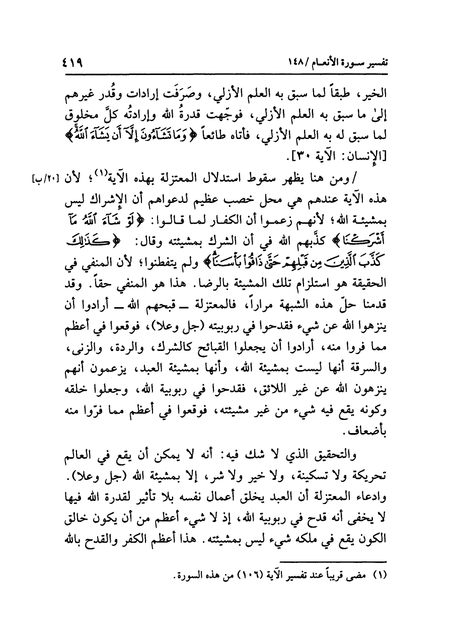[٢٠/ب] /ومن هنا يظهر سقوط استدلال المعتزلة بهذه الآية (¬١)؛ لأن هذه الآية عندهم هي محل خصب عظيم لدعواهم أن الإشراك ليس بمشيئة الله؛ لأنهم زعموا أن الكفار لما قالوا: {لَوْ شَاء اللهُ مَا أَشْرَكْنَا} كذبهم الله في أن الشرك بمشيئته وقال: {كَذَلِكَ كَذَّبَ الَّذِينَ مِن قَبْلِهِم حَتَّى ذَاقُواْ بَأْسَنَا} ولم يتفطنوا؛ لأن المنفي في الحقيقة هو استلزام تلك المشيئة بالرضا، هذا هو المنفي حقّاً، وقد قدمنا حل هذه الشبهة مراراً، فالمعتزلة -قبحهم الله- أرادوا أن يُنَزِّهُوا الله عن شيء فقدحوا في ربوبيته (جل وعلا)، فوقعوا في أعظم مِمَّا فَرُّوا مِنْه، أرادوا أن يجعلوا القبائح؛ كالشرك، والردة، والزنا، والسرقة أنها ليست بمشيئة الله وأنها بمشيئة العبد، يزعمون أنهم ينزهون الله عن غير اللائق، فَقَدَحُوا في ربوبية الله، وجَعَلُوا خَلْقه وكونه يقع فيه شيء من غير مشيئته، فوقعوا في أعظم مما فرُّوا مِنْهُ بِأَضْعَاف.