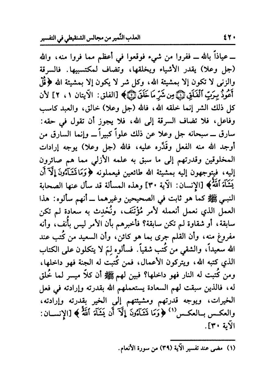 -عياذاً بالله- ففروا من شيء فَوَقَعُوا في أعظم مما فَرّوا مِنْهُ، والله (جل وعلا) يقدر الأشياء ويخلقها، وتضاف لمكتسبيها، فالسرقة والزنا لا تكون إلا بمشيئة الله، وكل شر لا يكون إلا بمشيئة الله {قُلْ أَعُوذُ بِرَبِّ الْفَلَقِ (١) مِن شَرِّ مَا خَلَقَ (٢)} [الفلق: الآيتان ١، ٢] لأن كل ذلك الشر إنما خَلَقَهُ الله، فالله (جل وعلا) خالق، والعبد كاسب وفاعل، فلا تُضَافُ السَّرِقَةُ إلى الله، فلا يجوز أن تقول في حقه: سارق -سبحانه جل وعلا عن ذلك علوّاً كبيراً! - وإنما السارق مَنْ أَوْجَدَ الله منه الفعل وقَدَّره عليه، فالله (جل وعلا) يُوَجِّهُ إرادات المخلوقين وقدرتهم إلى مَا سَبَقَ به علمه الأزلي مما هم صائرون إليه، فيَتَوَجَّهون إليه بمشيئة الله طائعين فيعملونه {وَمَا تَشَاءُونَ إِلَّا أَن يَشَاءَ اللهُ} [الإنسان: الآية ٣٠] وهذه المسألة قد سأل عنها الصحابة النبي - صلى الله عليه وسلم - كما هو ثابت في الصحيحين وغيرهما أنهم سألوه: هذا العمل الذي نعمل أنعمله لأمر مُؤْتَنَف، ونُحْدِث به سعادة لم تكن سابقة، أو شقاوة لم تكن سابقة؟ فأخبرهم بأن الأمر ليس بأُنف، وأنه مفروغ منه، وأن القَلَمَ جَرَى بما هو كائن، وأن السَّعِيدَ مَنْ كُتِبَ عِنْدَ الله سعيداً، والشقي من كُتب شقيّاً، فسألوه: لِمَ لا يَتَّكِلُونَ على الكتاب الذي كَتَبَهُ الله، ويتركون الأعمال، فمن كُتبت له الجنة فهو داخلها، ومن كتبت له النار فهو داخلها؟ فبين لهم - صلى الله عليه وسلم - أن كلاًّ مُيَسَّرٌ لما خُلق له، فالذين سبقت لهم السعادة يستعملهم الله بقدرته وإرادته في فعل الخَيْرات، ويوجه قدرتهم ومشيئتهم إلى الخير بقدرته وإرادته، والعكس بالعكس (¬١)