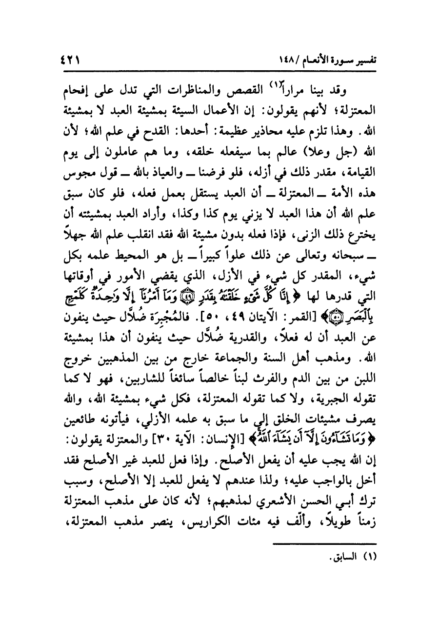 وقد بَيَّنَّا مِرَاراً (¬١) القصص والمناظرات التي تدل على إفحام المعتزلة؛ لأنهم يقولون: إن الأعمال السيئة بمشيئة العبد لا بمشيئة الله، وهذا تلزم عليه محاذير عظيمة: