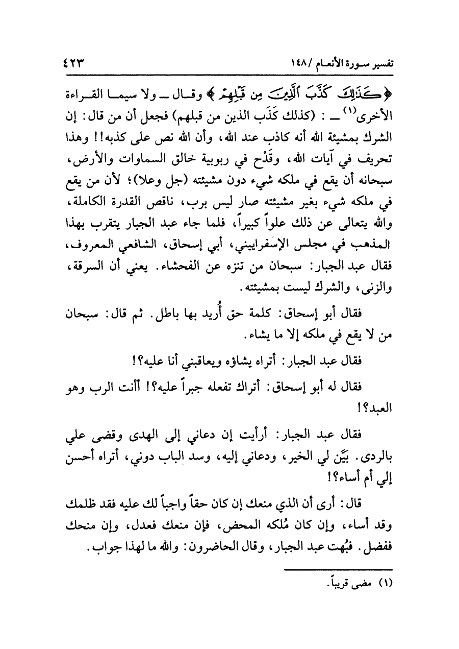 {كَذَلِكَ كَذَّبَ الَّذِينَ مِن قَبْلِهِم} وقال- ولا سيما القراءة الأخرى (¬١) -: (كذلك كَذب الذين من قبلهم) فجعل أن مَنْ قال: إن الشرك بمشيئة الله أنه كاذب عند الله، وأن الله نص على كذبه!! وهذا تحريف في آيات الله، وقَدْح في ربوبية خالق السماوات والأرض سبحانه أن يقع في ملكه شيء دون مشيئته (جل وعلا)؛ لأن من يقع في ملكه شيء بغير مشيئته صار ليس برب، ناقص القدرة الكاملة، والله يَتَعَالى عن ذلك علوّاً كبيراً، فلما جاء عبد الجبار يَتَقَرَّب بهذا المذهب في مجلس الإسفراييني أبي إسحاق الشافعي المعروف، فقال عبد الجبار: سبحان مَنْ تَنَزَّهَ عَنِ الفحشاء! يعني أن السرقة والزنا والشرك ليست بمشيئته.