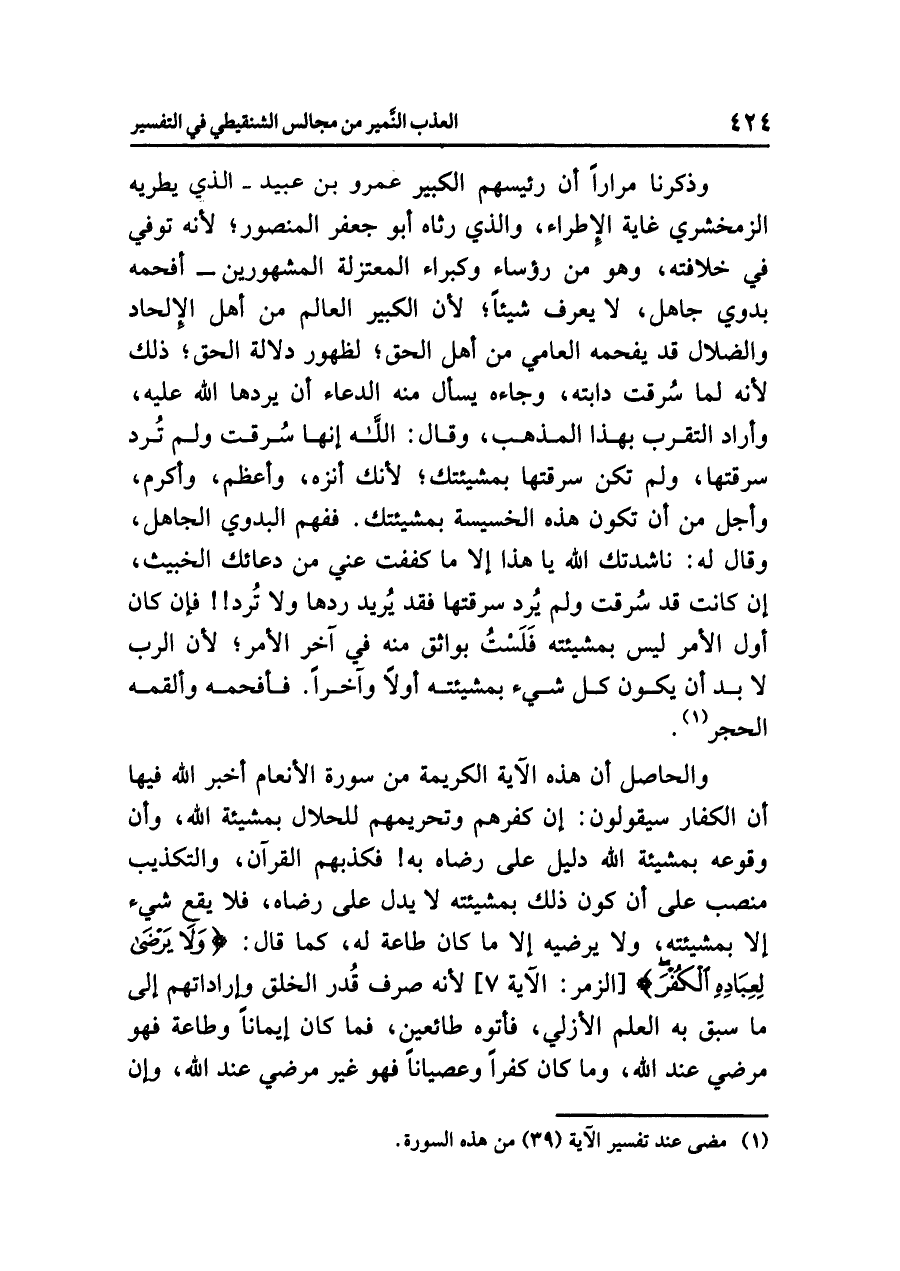والحاصل أن هذه الآية الكريمة من سورة الأنعام أخْبَرَ الله فيها أن الكفار سيقولون: إن كُفْرَهُمْ وتَحْرِيمَهُم للحلال بمشيئة الله، وأن وقوعه بمشيئة الله دليل على رضاه به! فكذّبهم القرآن، والتكذيب مُنْصَبٌّ على أن كون ذلك بمشيئته لا يدل على رضاه، فلا يقع شيء إلا بمشيئته، ولا يرضيه إلا ما كان طاعة له، كما قال: {وَلَا يَرْضَى لِعِبَادِهِ الْكُفْرَ} [الزمر: الآية ٧] لأنه صرف قُدَر الخلق وإراداتهم إلى ما سبق به العلم الأزلي، فأتوه طائعين، فما كان إيماناً وطاعة فهو مرضي عند الله، وما كان كفراً وعصياناً فهو غير مرضي عند الله، وإن