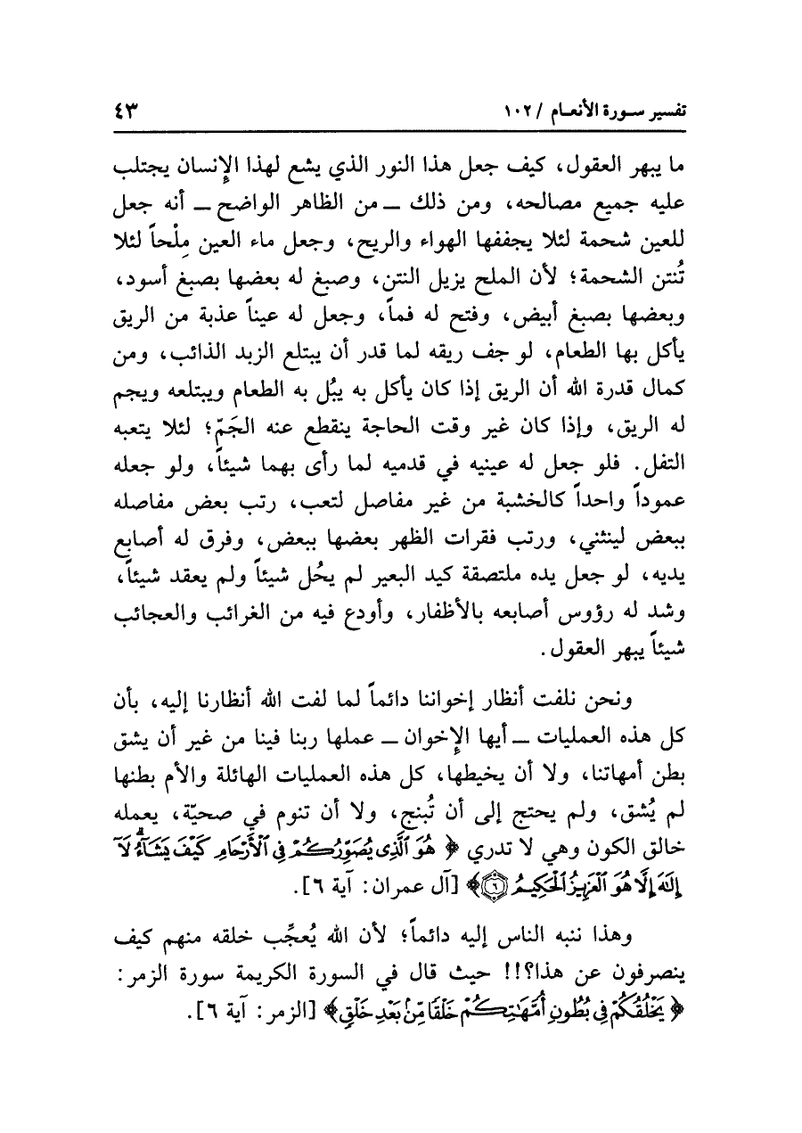 ونحن نلفتُ أنظارَ إخوانِنا دائمًا لِمَا لفتَ اللَّهُ أنظارَنا إليه، بِأَنَّ كُلَّ هذه العملياتِ - أيها الِإخوانُ - عَمِلَهَا ربُّنا فينا من غيرِ أن يشقَّ بطنَ أمهاتِنا، ولا أن يخيطَها، كُلُّ هذه العملياتِ الهائلةِ والأُمُّ بطنُها لم يُشَقَّ، ولم يَحْتَجْ إلى أن تُبنج، ولا أن تنومَ في صحيّة، يعملُه خالقُ الكونِ وهي لا تدري: {هُوَ الَّذِي يُصَوِّرُكُمْ فِي الأَرْحَامِ كَيْفَ يَشَاءُ لَا إِلَهَ إِلَاّ هُوَ الْعَزِيزُ الْحَكِيمُ (٦)} [آل عمران: آية ٦].