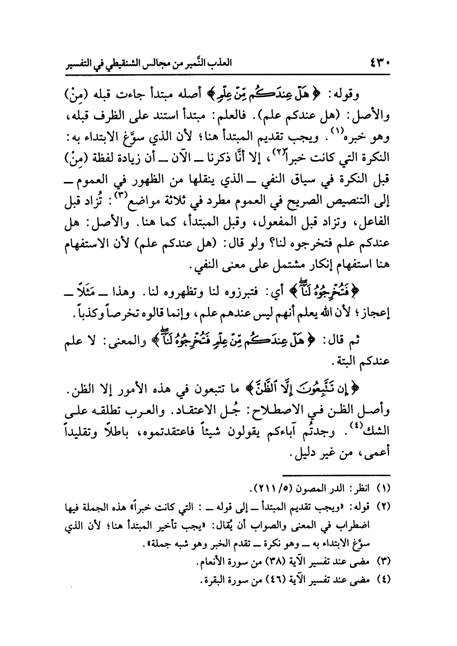 وقوله: {هَلْ عِندَكُم مِّنْ عِلْمٍ} أصله مبتدأ جاءت قبله (مِنْ) والأصل: (هل عندكم علم)، فالعلم: مبتدأ استند على الظرف قبله، وهو خبره (¬١)، ويجب تقديم المبتدأ هنا؛ لأن الذي سوَّغ الابتداء به: النكرة التي كانت خبراً (¬٢)، إلا أنَّا ذكرنا -الآن- أن زيادة لفظة (مِنْ) قبل النكرة في سياق النفي -الذي ينقلها من الظهور في العموم- إلى التنصيص الصريح في العموم مطرد في ثلاثة مواضع (¬٣): تُزاد قبل الفاعل، وتزاد قبل المفعول، وقبل المبتدأ كما هنا، والأصل: هل عندكم علم فتخرجوه لنا؟ ولو قال: (هل عندكم علم) لأن الاستفهام هنا استفهام إنكار مشتمل على معنى النفي.