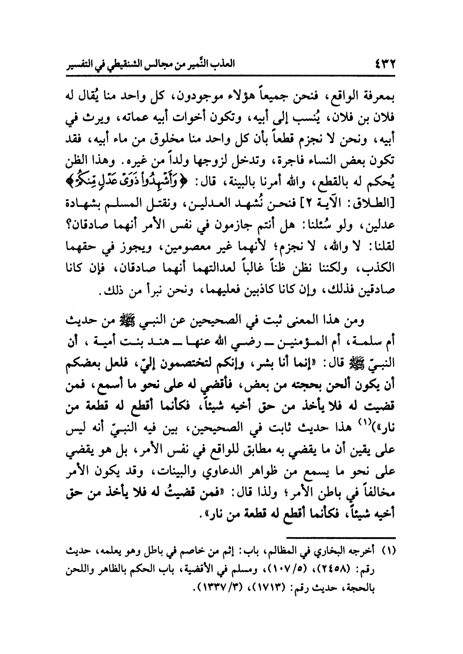 ومن هذا المعنى ثَبَتَ في الصحيحين عن النبي - صلى الله عليه وسلم - من حديث أم سلمة أم المؤمنين -رضي الله عنها- هند بنت أمية، أن النبي - صلى الله عليه وسلم - قال: «إِنَّمَا أَنَا بَشَرٌ، وَإِنَّكُمْ لَتَخْتَصِمُونَ إِلَيَّ، فَلَعَلَّ بَعْضَكُمْ أَنْ يَكُونَ أَلحَنَ بِحُجَّتِهِ مِنْ بَعْضٍ فَأَقْضِي لَهُ عَلَى نَحْوِ مَا أَسْمَعُ، فَمَنْ قَضَيْتُ لَهُ فَلَا يَأْخُذْ مِنْ حَقِّ أَخِيهِ شَيْئاً، فَكَأَنَّمَا أَقْطَعُ لَهُ قِطْعَةً مِنْ نَارٍ» (¬١) هذا حديث ثابت في الصحيحين، بَيَّنَ فِيهِ النَّبِيّ أنه ليس على يقين أن ما يقضي به مطابق للواقع في نفس الأمر، بل هو يقضي على نحو ما يسمع من ظواهر الدعاوي والبيِّنَات، وقد يكون الأمر مخالفاً في باطن الأمر؛ ولذا قال: «فَمَنْ قَضَيْتُ لَهُ فَلَا يَأْخُذْ مِنْ حَقِّ أَخِيهِ شَيْئاً، فَكَأَنَّمَا أَقْطَعُ لَهُ قِطْعَةً مِنْ نَارٍ».