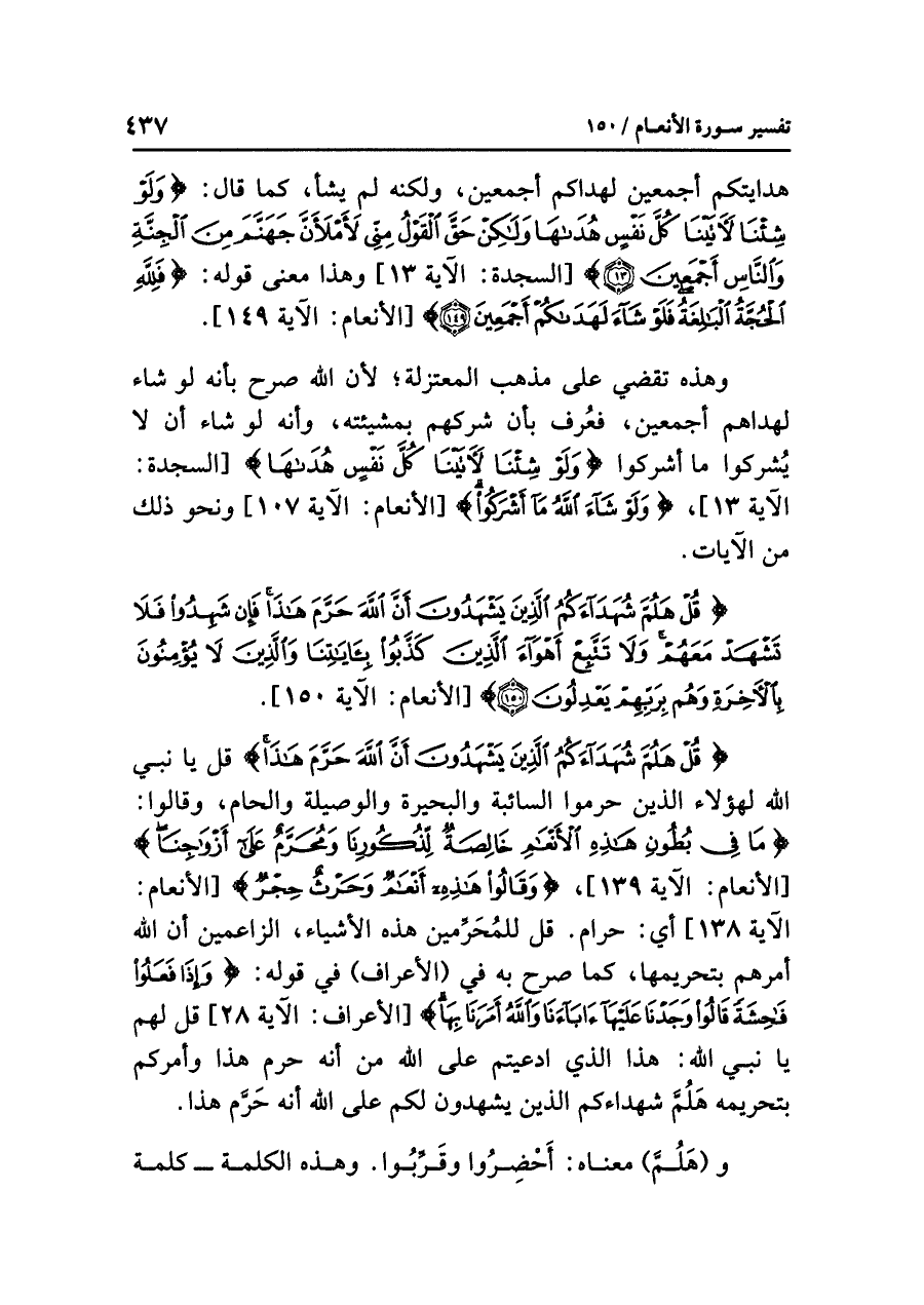 وهذه تقضي على مذهب المعتزلة؛ لأن الله صرح بأنه لو شاء لهداهم أجمعين، فعُرف بأن شركهم بمشيئته، وأنه لو شاء أن لا يُشركوا ما أشركوا {وَلَوْ شِئْنَا لَآتَيْنَا كُلَّ نَفْسٍ هُدَاهَا} [السجدة: الآية ١٣] {وَلَوْ شَاء اللهُ مَا أَشْرَكُواْ} [الأنعام: الآية ١٠٧] ونحو ذلك من الآيات.