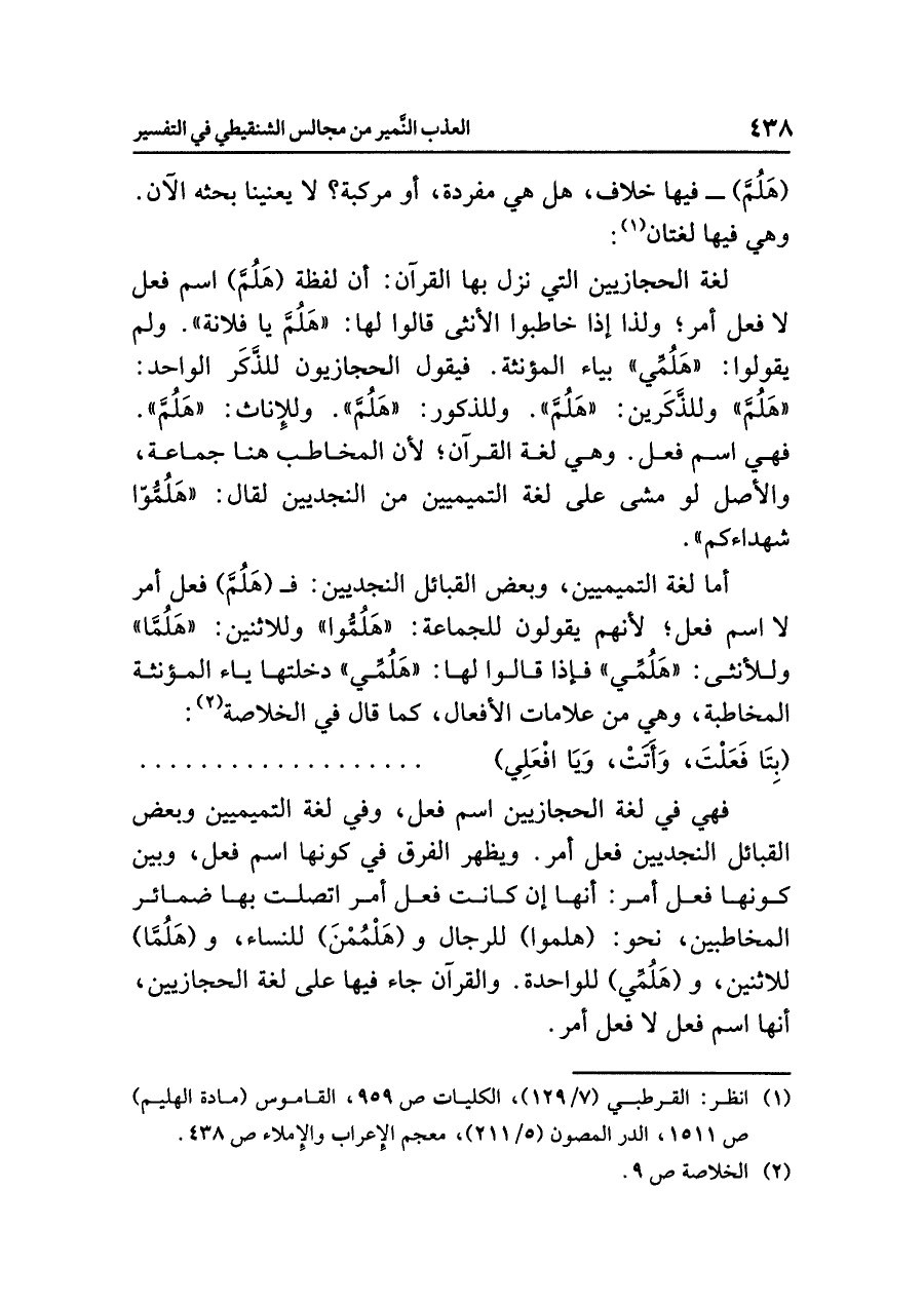 أما لغة التميميين، وبعض القبائل النجديين: فـ (هَلُمَّ) فعل أمر لا اسم فعل؛ لأنهم يقولون للجماعة: «هَلُمُّوا» وللاثنين: «هَلُمَّا» وللأنثى: «هَلُمِّي» فإذا قالوا لها: «هَلُمِّي» دخلتها ياء المؤنثة المخاطبة، وهي من علامات الأفعال، كما قال في الخلاصة (¬٢):