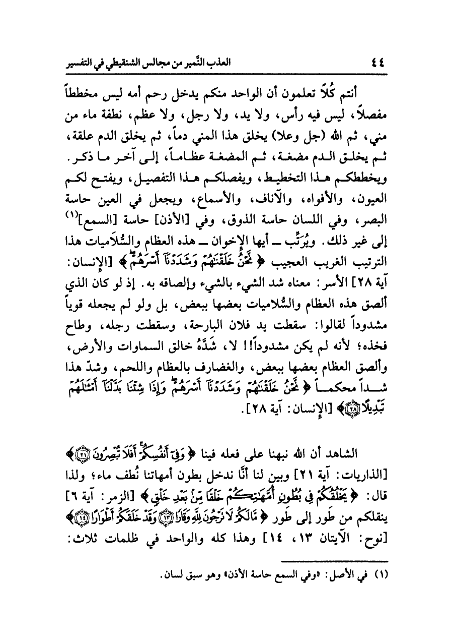 أنتم كُلاّ تعلمونَ أن الواحدَ منكم يدخلُ رَحِمَ أُمِّهِ ليس مُخَطَّطًا مفصلاً، ليس فيه رأسٌ ولا يدٌ ولا رجلٌ ولا عظمٌ، نطفةُ ماءٍ من مَنِيٍّ، ثم الله (جل وعلا) يخلقُ هذا الْمَنِيَّ دَمًا، ثم يخلقُ الدمَ علقةً، ثم يخلقُ الدمَ مضغةً، ثم المضغةَ عظامًا، إلى آخِرِ ما ذَكَرَ. ويخططُكم هذا التخطيطَ، ويفصلكم هذا التفصيلَ، ويفتحُ لكم العيونَ، والأفواهَ والآنافَ والأسماعَ، ويجعلُ في العينِ حاسةَ البصرِ، وفي اللسانِ حاسةَ الذوقِ، وفي [الأُذُنِ] حاسةَ [السمعِ] (¬١) إلى غيرِ ذلك. ويُرَتِّبُ - أيها الإخوانُ - هذه العظامَ والسُّلامياتِ هذا الترتيبَ الغريبَ العجيبَ {نَحْنُ خَلَقْنَاهُمْ وَشَدَدْنَا أَسْرَهُمْ} [الإنسان: آية ٢٨] الأَسْرُ: معناه شَدُّ الشيءِ بالشيءِ وإلصاقُه به؛ إِذْ لو كان الذي ألصقَ هذه العظامَ والسُّلاميات بعضَها ببعضٍ، بل ولو لم يَجْعَلْهُ قَوِيًّا مشدودًا لقالوا: سَقَطَتْ يدُ فلانٍ البارحةَ، وَسَقَطَتْ رِجْلُهُ، وطاحَ فَخِذُهُ؛ لأنه لم يكن مَشْدُودًا!! لا، شَدَّهُ خالقُ السماواتِ والأرضِ، وألصقَ العظامَ بعضَها ببعضٍ، والغضارفَ بالعظامِ واللحمِ، وشدَّ هذا شَدًّا مُحْكَمًا: {نَحْنُ خَلَقْنَاهُمْ وَشَدَدْنَا أَسْرَهُمْ وَإِذَا شِئْنَا بَدَّلْنَا أَمْثَالَهُمْ تَبْدِيلاً (٢٨)} [الإنسان: آية ٢٨].