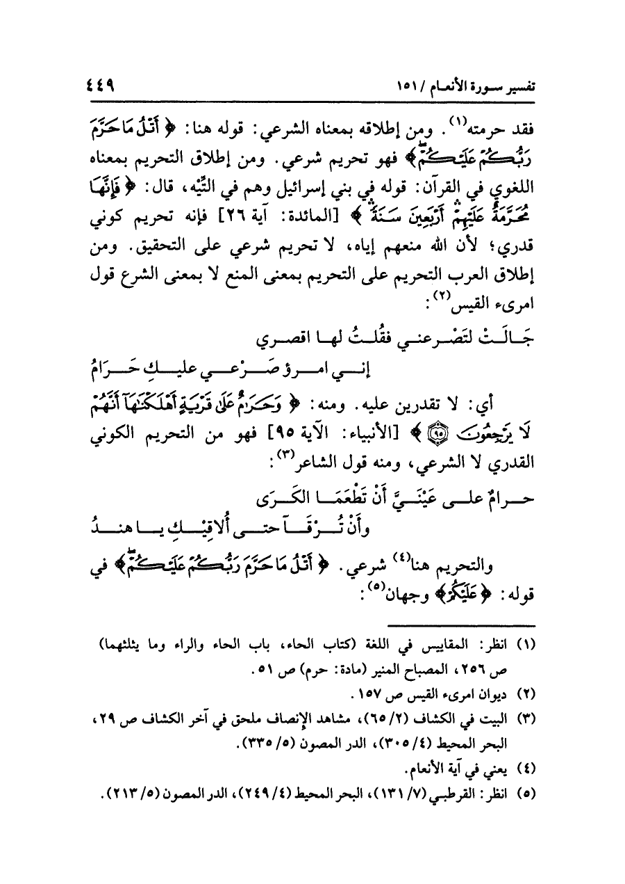 فقد حرمته (¬١)، ومن إطلاقه بمعناه الشرعي: قوله هنا: {أَتْلُ مَا حَرَّمَ رَبُّكُمْ عَلَيْكُمْ} فهو تحريم شَرْعِيٌّ، ومن إطلاق التحريم بمعناه اللغوي في القرآن: قوله في بني إسرائيل وهم في التِّيْه، قال: {فَإِنَّهَا مُحَرَّمَةٌ عَلَيْهِمْ أَرْبَعِينَ سَنَةً} [المائدة: آية ٢٦] فإنه تحريم كوني قَدَري؛ لأن الله منعهم إياه، لا تحريم شَرْعِيّ على التحقيق، ومن إطلاق العرب التحريم على التحريم بمعنى المنع لا بمعنى الشرع: قول امرئ القيس (¬٢):