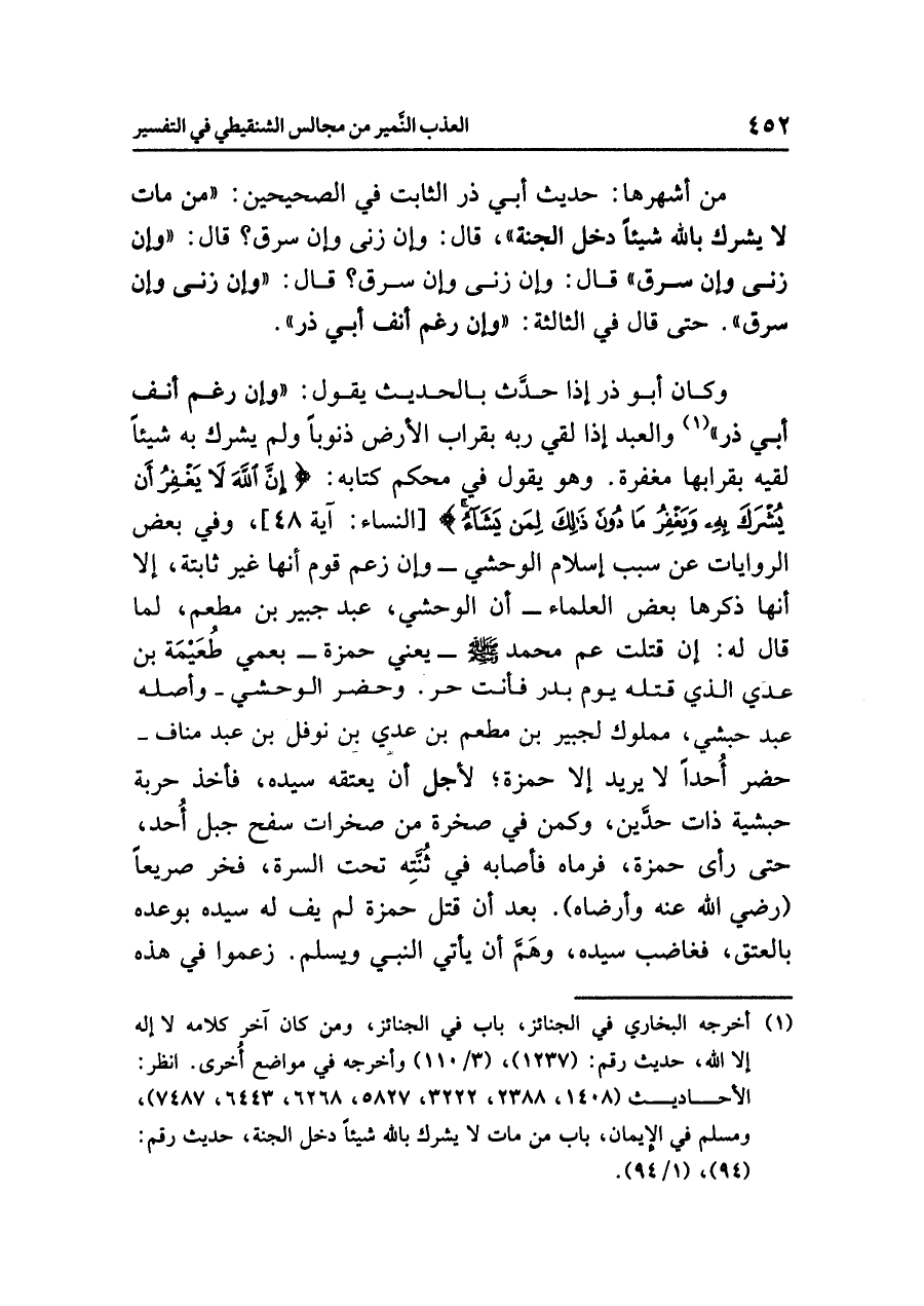 من أشهرها: حديث أبي ذر الثابت في الصحيحين: «مَنْ مَاتَ لَا يُشْرِكُ بِاللهِ شَيْئاً دَخَلَ الجَنَّةَ»، قال: وإن زنى وإن سرق؟ قال: «وَإِنْ زَنَى وَإِنْ سَرَقَ» قال: وإن زنى وإن سرق؟ قال: «وَإِنْ زَنَى وَإِنْ سَرَقَ». حتى قال في الثالثة: «وَإِنْ رَغِمَ أَنْفُ أَبِي ذَرٍّ»، وكان أبو ذر إذا حدَّث بالحديث يقول: «وَإِنْ رَغِمَ أَنْفُ أَبِي ذَرٍّ» (¬١).