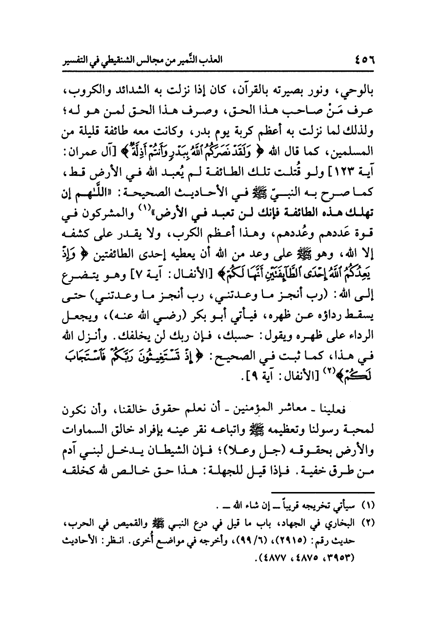 بالوحي ونور بصيرته بالقرآن، كان إذا نزلت به الشدائد والكروب عرف مَنْ صاحب هذا الحق، وصَرَفَ هَذا الحق لمن هو له؛ ولذلك لما نَزَلَتْ به أعظم كُرْبَةٍ يَوْم بدر، وكانت معه طائفة قليلة من المسلمين، كما قال الله: {وَلَقَدْ نَصَرَكُمُ اللهُ بِبَدْرٍ وَأَنتُمْ أَذِلَّةٌ} [آل عمران: آية ١٢٣] ولو قُتلت تلك الطائفة لم يُعْبَدِ الله في الأرض قَطّ، كما صَرَّحَ به النبي - صلى الله عليه وسلم - في الأحاديث الصحيحة: «اللهُمَّ إن تَهْلِك هذه الطَّائِفة فإنك لن تُعْبَدَ في الأرْضِ» (¬١)