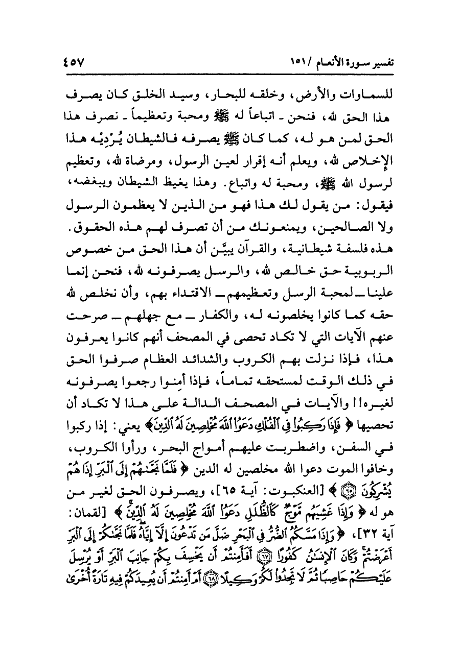 للسماوات والأرض وخلقه للبحار، وسيد الخلق كان يصرف هذا الحق لله، فنحن -اتباعاً له - صلى الله عليه وسلم - ومحبَّةً وتَعْظِيماً- نَصْرِفُ هذَا الحق لمن هو له، كما كان - صلى الله عليه وسلم - يصرفه فالشيطان يُردِيْه هذا الإخلاص لله، ويعلم أنه إقرار لعين الرسول، ومرضاة لله، وتعظيم لرسول الله - صلى الله عليه وسلم -، ومحبة له واتباع، وهذا يغيظ الشيطان ويبغضه، فيقول: من يقول لك هذا فهو من الذين لا يعظمون الرسول ولا الصالحين، ويمنعونك من أن تصرف لهم هذه الحقوق، هذه فلسفة شيطانية، والقرآن يبيّن أن هذا الحق من خصوص الربوبية حق خالص لله، والرسل يصرفونه لله، فنحن إنما علينا -لمحبة الرسل وتعظيمهم- الاقتداء بهم، وأن نُخْلِصَ لله حَقَّهُ كما كانوا يخلصونه له، والكفار -مع جهلهم- صرحت عنهم الآيات التي لا تكاد تُحْصَى في المصحف أنهم كانوا يعرفون هذا، فإذا نَزَلَتْ بهم الكروب والشدائد العظام صَرَفُوا الحق في ذلك الوقت لمستحقِّه تَماماً، فإذا أمِنوا رجعوا يصرفونه لغيره! والآيات في المصحف الدالَّة على هذا لا تكاد أن تحصيها {فَإِذَا رَكِبُوا فِي الْفُلْكِ دَعَوُا اللهَ مُخْلِصِينَ لَهُ الدِّينَ} يعني: إذا ركبوا في السفن، واضطربت عليهم أمواج البحر ورَأوُا الكروب وخافوا الموت دعوا الله مخلصين له الدين {فَلَمَّا نَجَّاهُمْ إِلَى الْبَرِّ إِذَا هُمْ يُشْرِكُونَ} [العنكبوت: آية ٦٥]، ويصرفون الحَقَّ لغير من هو له {وَإِذَا غَشِيَهُم مَّوْجٌ كَالظُّلَلِ دَعَوُا اللهَ مُخْلِصِينَ لَهُ الدِّينَ} [لقمان: آية ٣٢]، {وَإِذَا مَسَّكُمُ الضُّرُّ فِي الْبَحْرِ ضَلَّ مَن تَدْعُونَ إِلَّا إِيَّاهُ فَلَمَّا نَجَّاكُمْ إِلَى الْبَرِّ أَعْرَضْتُمْ وَكَانَ الإِنْسَانُ كَفُوراً (٦٧) أَفَأَمِنتُمْ أَن يَخْسِفَ بِكُمْ جَانِبَ الْبَرِّ أَوْ يُرْسِلَ عَلَيْكُمْ حَاصِباً ثُمَّ لَا
