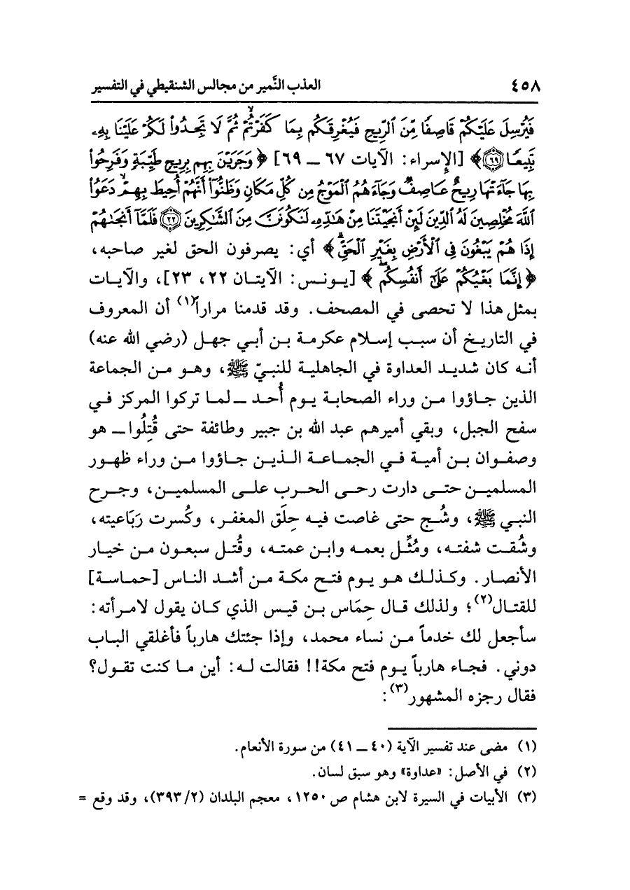فَيُرْسِلَ عَلَيْكُمْ قَاصِفا مِّنَ الرِّيحِ فَيُغْرِقَكُم بِمَا كَفَرْتُمْ ثُمَّ لَا تَجِدُواْ لَكُمْ عَلَيْنَا بِهِ تَبِيعاً (٦٩)} [الإسراء: الآيات ٦٧ - ٦٩] {وَجَرَيْنَ بِهِم بِرِيحٍ طَيِّبَةٍ وَفَرِحُواْ بِهَا جَاءتْهَا رِيحٌ عَاصِفٌ وَجَاءهُمُ المَوْجُ مِن كُلِّ مَكَانٍ وَظَنُّواْ أَنَّهُمْ أُحِيطَ بِهِمْ دَعَوُاْ اللهَ مُخْلِصِينَ لَهُ الدِّينَ لَئِنْ أَنجَيْتَنَا مِنْ هَذِهِ لَنَكُونَنِّ مِنَ الشَّاكِرِينَ (٢٢) فَلَمَّا أَنجَاهُمْ إِذَا هُمْ يَبْغُونَ فِي الأَرْضِ بِغَيْرِ الْحَقِّ} أي: يصرفون الحق لغير صاحبه، {إِنَّمَا بَغْيُكُمْ عَلَى أَنفُسِكُم} [يونس: الآيتان ٢٢، ٢٣]، والآيات بمثل هذا لا تحصى في المصحف، وقد قَدَّمْنَا مراراً (¬١) أن المعروف في التاريخ أن سبب إسلام عكرمة بن أبي جهل (رضي الله عنه) أنه كان شديد العداوة في الجاهلية للنبي - صلى الله عليه وسلم -، وهو مِنَ الجماعة الذين جاءوا من وراء الصحابة يوم أُحد -لما تركوا المركز في سفح الجبل، وبقي أميرهم عبد الله بن جبير وطائفة حتى قُتِلُوا- هو وصفوان بن أمية في الجماعة الذين جاءوا من وراء ظهور المسلمين حتى دارت رَحَى الحرب على المسلمين، وجرح النبي - صلى الله عليه وسلم -، وشُجَّ حتى غاصت فيه حِلَق المغفر، وكُسِرَتْ رَبَاعِيَّتُهُ، وشُقَّت شفته، ومُثِّل بعمه وابن عمته، وقُتل سبعون من خيار الأنصار، وكذلك هو يوم فتح مكة من أشد الناس [حماسة] للقتال (¬٢)؛ ولذلك قال حِمَاس بن قيس الذي كان يقول لامرأته: سأجعل لك خدماً من نساء محمد، وإذا جئتك هارباً فأَغْلِقِي الباب دوني، فجاء هارباً يوم فتح مكة! فقالت له: أين ما كنت تقول؟ فقال رجزه المشهور (¬٣):
