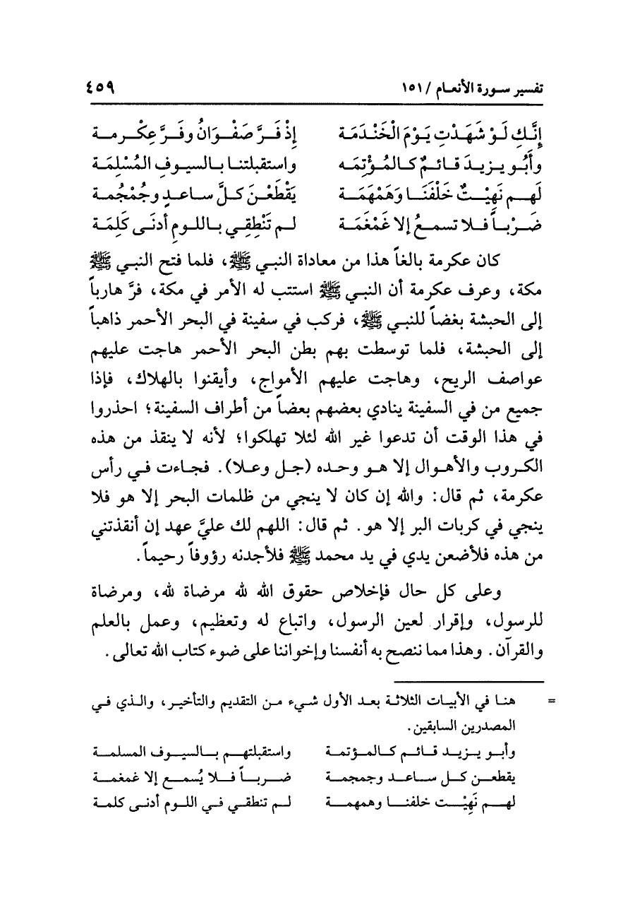 كان عكرمة بالغاً هذا من معاداة النبي - صلى الله عليه وسلم -، فلما فتح النبي - صلى الله عليه وسلم - مكة، وعرف عكرمة أن النبي - صلى الله عليه وسلم - اسْتَتَبَّ لَهُ الأمر في مكة، فرَّ هارباً إلى الحبشة بغضاً للنبي - صلى الله عليه وسلم -، فَرَكِبَ في سفينة في البحر الأحمر ذاهباً إلى الحبشة، فلمَّا تَوَسَّطَتْ بهم بطن البحر الأحمر هاجت عليهم عواصف الريح، وهاجت عليهم الأمواج، وأيقنوا بالهلاك، فإذا جميع من في السفينة ينادي بعضهم بعضاً من أطراف السفينة؛ احذروا في هذا الوقت أن تدعوا غير الله لئلا تهلكوا؛ لأنه لا ينقذ من هذه الكروب والأهوال إلا هو وحده (جل وعلا)، فجاءت في رأس عكرمة، ثم قال: والله إن كان لا ينجي من ظلمات البحر إلا هو فلا ينجي في كربات البر إلا هو، ثم قال: اللهم لَكَ عليَّ عهد إن أنْقَذْتَنِي من هذه فلأضَعَنَّ يَدِي في يد محمد - صلى الله عليه وسلم - فلأجدنَّه رؤوفاً رحيماً.