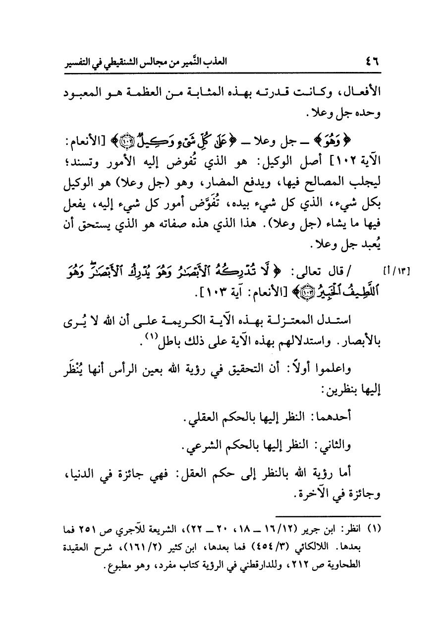 (¬١) انظر: ابن جرير (١٢/ ١٦ - ١٨، ٢٠ - ٢٢)، الشريعة للآجري ٢٥١ فما بعدها. اللالكائي (٣/ ٤٥٤) فما بعدها، ابن كثير (٢/ ١٦١)، شرح العقيدة الطحاوية ٢١٢. وللدارقطني في الرؤية كتاب مفرد وهو مطبوع.