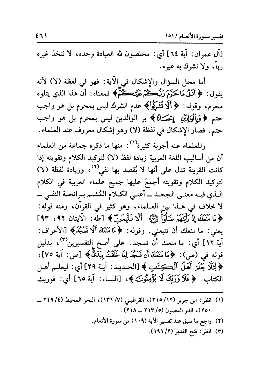 أما محل السؤال والإشكال في الآية: فهو في لفظة (لا) لأنه يقول: {أَتْلُ مَا حَرَّمَ رَبُّكُمْ عَلَيْكُمْ} فمعناه: أن هذا الذي يتلوه مُحَرَّم، وقوله: {أَلَّا تُشْرِكُواْ} عدم الشرك ليس بمحرم بل هو واجب حَتم {وَبِالْوَالِدَيْنِ إِحْسَاناً} بر الوالدين ليس بمحرم، بل هو واجب حتم، فصار الإشكال في لفظة (لا) وهو إشكال معروف عند العلماء.