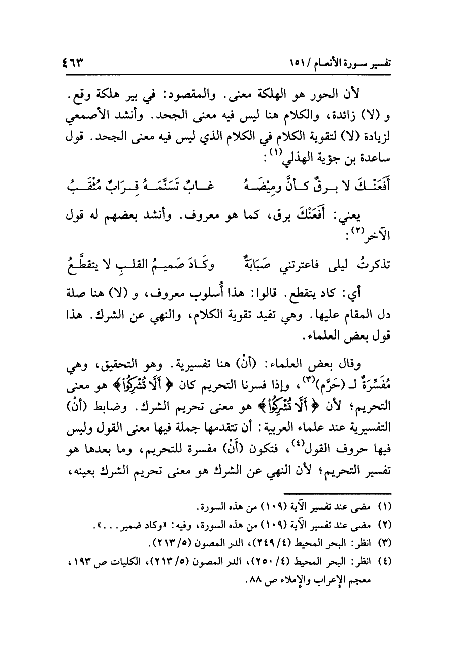 وقال بعض العلماء: (أنْ) هنا تفسيرية. وهو التحقيق، وهي مُفَسَّرَةٌ لـ {حَرَّمَ} (¬٣)، وإذا فسرنا التحريم كان {أَلَّا تُشْرِكُواْ} هو معنى التحريم؛ لأن {أَلَّا تُشْرِكُواْ} هو معنى تحريم الشرك. وضابط (أنْ) التفسيرية عند علماء العربية: أن تتقدمها جملة فيها معنى القول وليس فيها حروف القول (¬٤)، فتكون (أَنْ) مفسرة للتحريم، وما بعدها هو تفسير التحريم؛ لأن النهي عن الشرك هو معنى تحريم الشرك بعينه،
