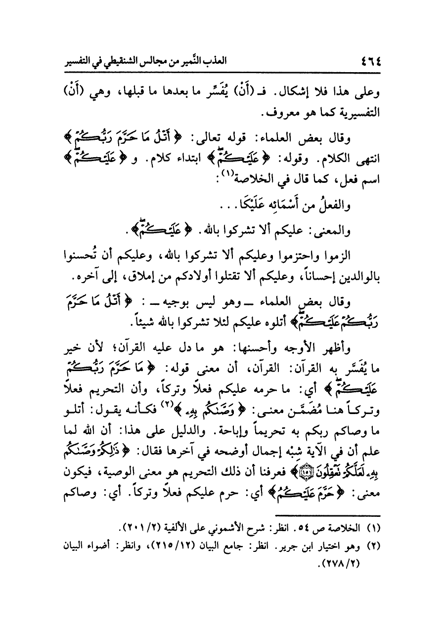 وقال بعض العلماء: قوله تعالى: {أَتْلُ مَا حَرَّمَ رَبُّكُمْ} انتهى الكلام. وقوله: {عَلَيْكُمْ} ابتداء كلام، و {عَلَيْكُمْ} اسم فعل، كما قال في الخلاصة (¬١):