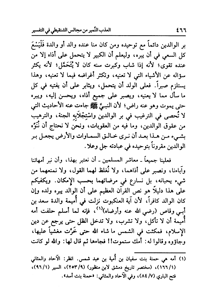فعلينا جميعاً معاشر المسلمين أن نعتبر بهذا، وأن نبر أمهاتنا وآباءنا، ونصبر على أذاهما، ولا نُغلظ لهما القول، ولا نمنعهما من شيء يحبانه، بل نسارع في مرضاتهما بحسب الإمكان، ويكفيكم على هذا دليلاً هو نص القرآن العظيم على أن الوالد يبره ولده وإن كان الوالد كافراً؛ لأن آية العنكبوت نزلت في أُميمة والدة سعد بن أبي وقاص (رضي الله عنه وأرضاه) (¬١)، فإنه لما أسلم حلفت أمه أُميمة أن لا تأكل، ولا تشرب، ولا تدخل الظل حتى يرجع عن دين الإسلام، فَمَكَثَتْ في الشمس ما شاء الله حتى خَرَّت مغشيّاً عليها، وجاءوه وقالوا له: أمك ستموت! فجاءها ثم قال لها: والله لو كانت