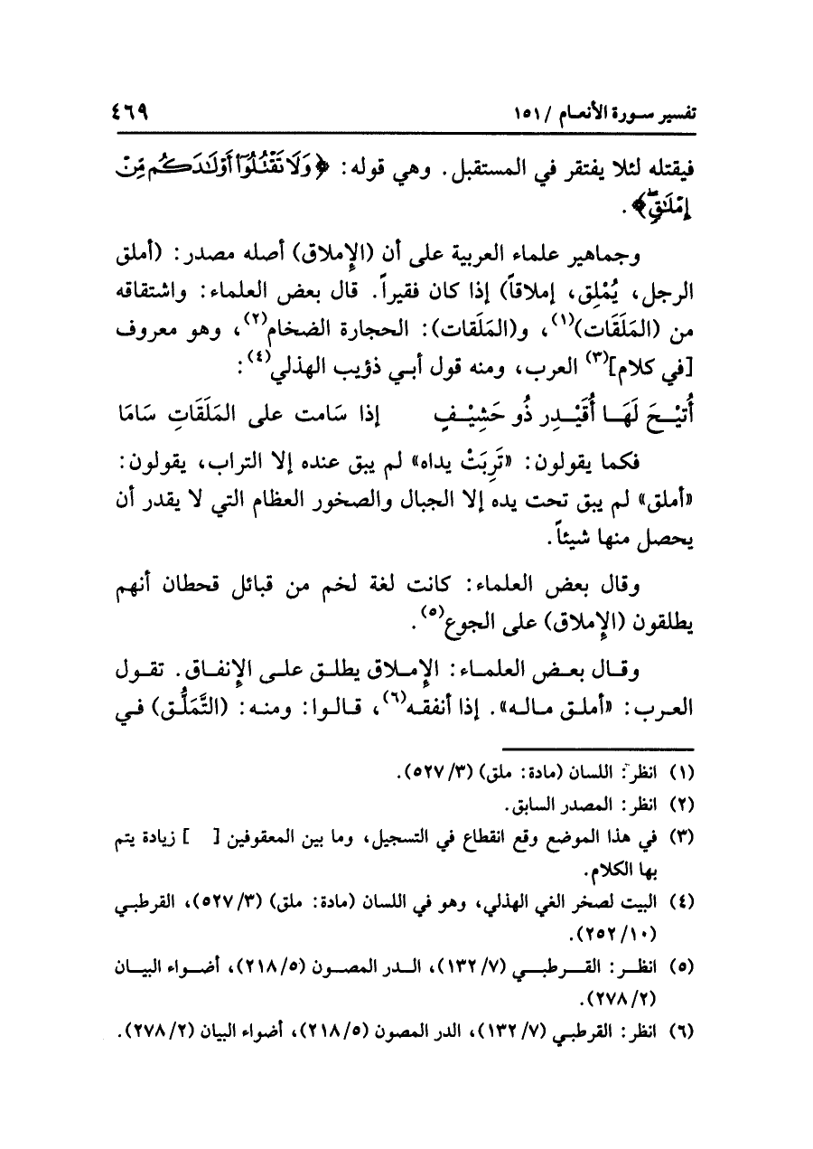 وجماهير علماء العربية على أن (الإملاق) أصله مصدر: (أملق الرجل، يُملِق، إملاقاً) إذا كان فقيراً، قال بعض العلماء: واشتقاقه من (المَلَقَات) (¬١)، و (المَلَقات): الحجارة الضخام (¬٢)، وهو معروف [في كلام] (¬٣) العرب، ومنه قول أبي ذؤيب الهذلي (¬٤):