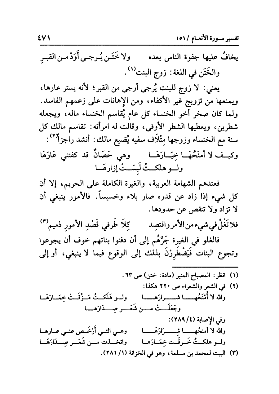 فالغلو في الغيرة جرَّهُم إلى أن دفنوا بناتهم خوف أن يجوعوا وتجوع البنات فَيَضْطَرِرْنَ بذلك إلى الوقوع فيما لا ينبغي، أو إلى