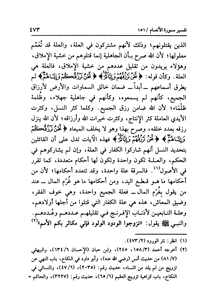 فالسرقة علة واحدة، وقد تتعدد أحكامها؛ لأن من أحكامها ما هو قطع اليد، ومن أحكامها ما هو غُرْم المال -عند من يقول بِغُرْم المال- فعلة الجميع واحدة، وهي خوف الفقر وضيق المعاش، هذه هي علة الكفار التي قَتَلُوا مِنْ أجْلِهَا أوْلَادَهُمْ، وعلة التابعين لأذناب الإفرنج في تقليلهم عددهم وعُددهم، والنبي - صلى الله عليه وسلم - يقول: «تَزَوَّجُوا الْوَدُودَ الْوَلُودَ؛ فَإِنِّي مُكَاثِرٌ بِكُمُ الْأُمَمَ» (¬٢)