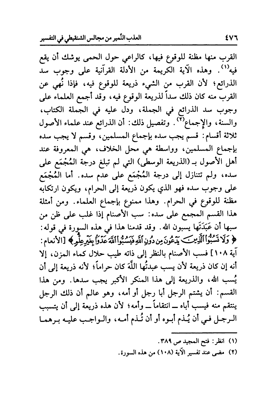 وتفصيل ذلك: أن الذرائع عند علماء الأصول ثلاثة أقسام: قسم يجب سَدُّه بِإِجْمَاعِ المُسْلِمين، وقسم لا يجب سده بإجماع المسلمين، وواسطة هي محل الخلاف، هي المعروفة عند أهل الأصول بـ (الذريعة الوسطى) التي لم تبلغ درجة المُجْمَع على سَدِّهِ ولم تتنازل إلى درجة المُجْمَع على عدم سده، أما المُجمَع على وجوب سَدِّهِ فهو الذي يكون ذريعة إلى الحرام، ويكون ارْتِكَابُهُ مظنة للوقوع في الحرام، وهذا ممنوع بإجماع العلماء، ومن أمثلة هذا القسم المجمع على سده: سب الأصنام إذا غلب على ظن مَنْ سَبَّهَا أن عَبَدَتَها يسبون الله، وقد قدمنا هذا في هذه السورة في قوله: {وَلَا تَسُبُّواْ الَّذِينَ يَدْعُونَ مِن دُونِ اللهِ فَيَسُبُّواْ اللهَ عَدْواً بِغَيْرِ عِلْمٍ} [الأنعام: آية ١٠٨] فسب الأصنام بالنظر إلى ذاته طيب حلال كماء المزن، إلا أنه إن كان ذريعة لِأَنْ يَسُبَّ عبدتُها اللهَ كان حراماً؛ لأنه ذريعة إلى أن يُسَبَّ الله، والذريعة إلى هذا المنكر الأكبر يجب سدها، ومِنْ هذا القسم: أن يشتم الرجل أبَا رَجُل أو أمه، وهو عالم أن ذلك الرجل يَنْتَقِم منه فيسب أباه -انتقاماً- وأمه؛ لأن هذه ذريعة إلى أن يتسبب الرجل في أن يُذم أبوه أو أن تُذم أمه، والواجب عليه برهما