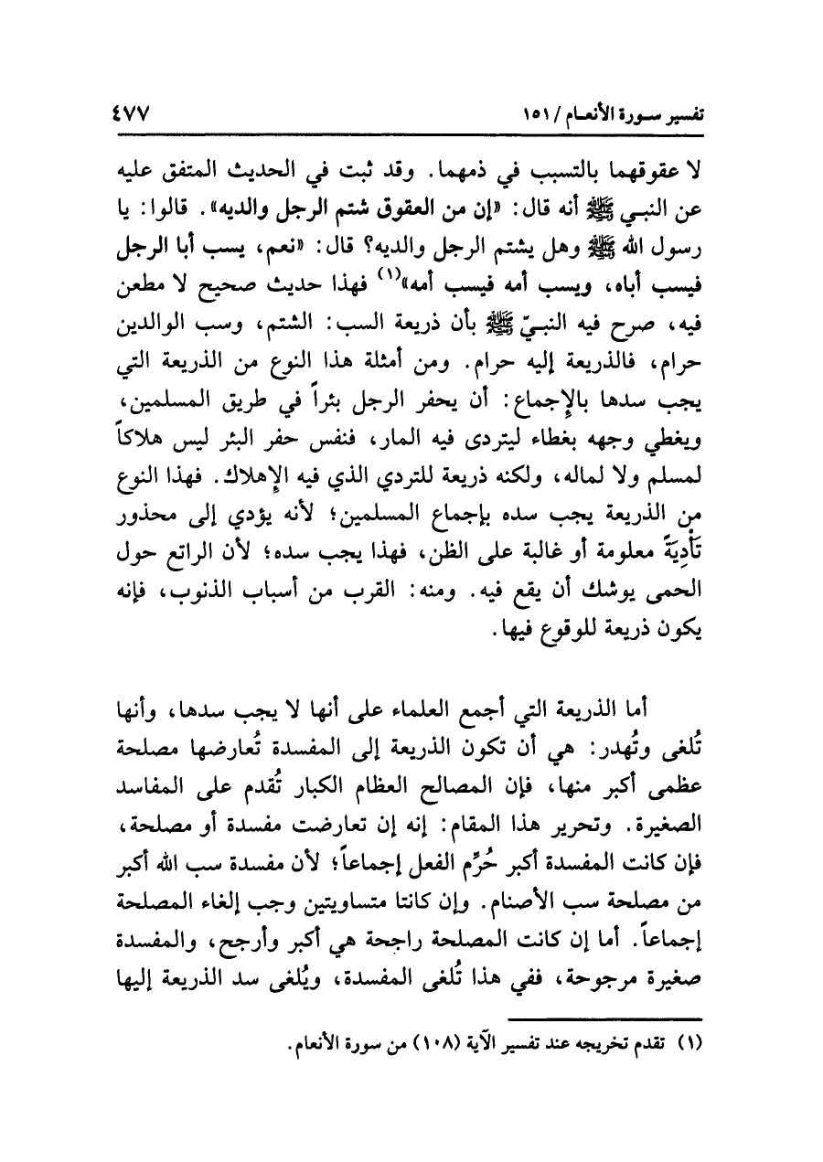 لا عقوقهما بالتسبب في ذمِّهِما، وقد ثبت في الحديث المتفق عليه عن النبي - صلى الله عليه وسلم - أنه قال: «إنَّ مِنَ العقوق شَتْمَ الرجل والِدَيْهِ». قالوا: يا رسول الله - صلى الله عليه وسلم - وهل يشتم الرجل والديه؟ قال: «نعم، يَسُبّ أبَا الرَّجُلِ فيسبّ أبَاهُ، ويسبّ أمه فيسُبّ أمَّهُ» (¬١) فهذا حديث صحيح لا مطعن فيه، صرح فيه النبي - صلى الله عليه وسلم - بأن ذريعة السب: الشتم، وسب الوالدين حرام، فالذريعة إليه حرام، ومن أمثلة هذا النوع من الذريعة التي يجب سدها بالإجماع: أن يحفر الرجل بئراً في طريق المسلمين ويغطي وجهه بغطاء ليتردى فيه المار، فنفس حفر البئر ليس هلاكاً لمسلم ولا لماله، ولكنه ذريعة للترَدِّي الذي فيه الإهلاك.