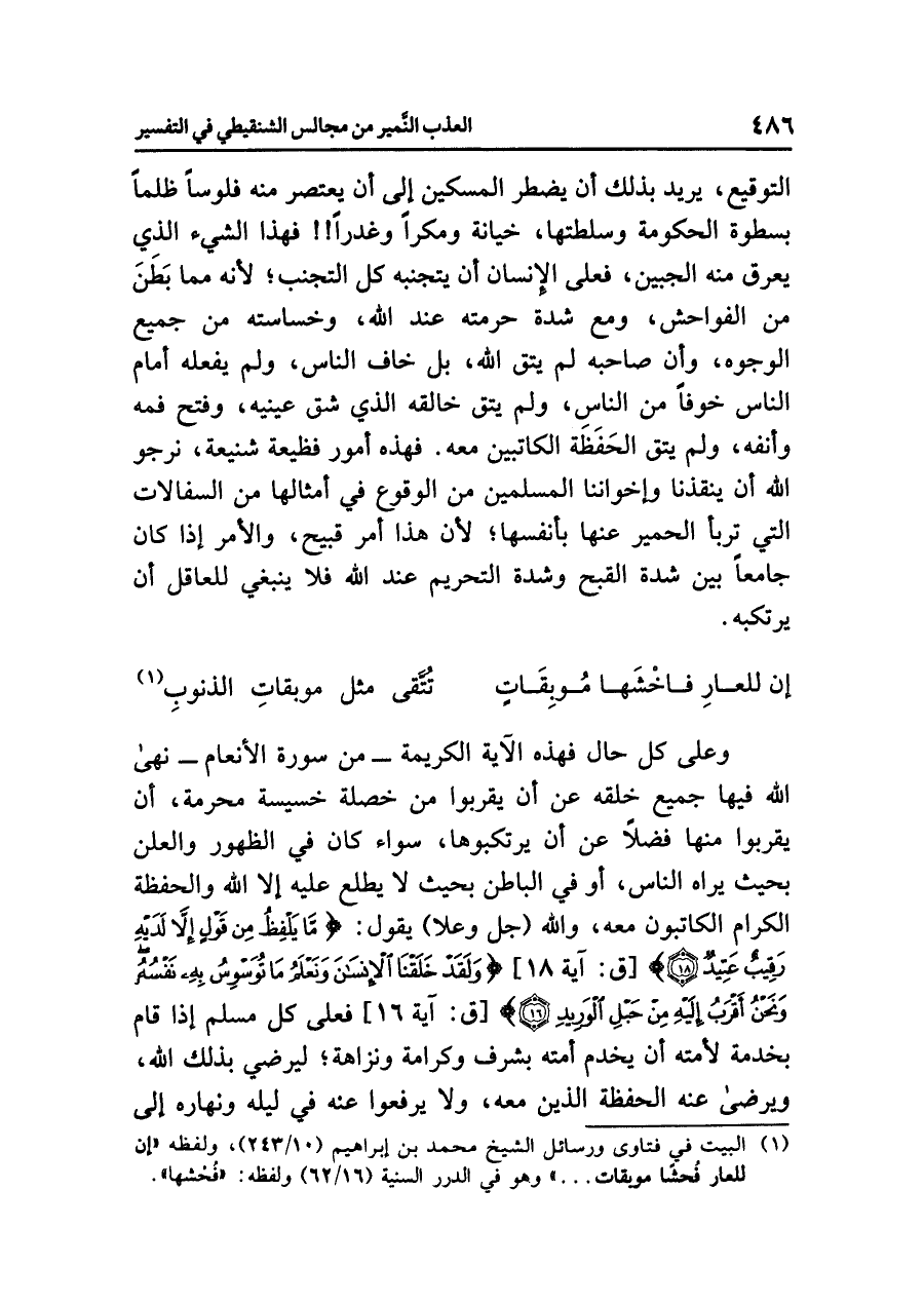 وعلى كل حال فهذه الآية الكريمة -من سورة الأنعام- نهى الله فيها جميع خلقه عن أن يقربوا من خصلة خسيسة محرمة، أن يقربوا منها فضلاً عن أن يرتكبوها، سواء كان في الظهور والعلن بحيث يراه الناس، أو في الباطن بحيث لا يطلع عليه إلا الله والحفظة الكرام الكاتبون معه، والله (جل وعلا) يقول: {مَا يَلْفِظُ مِن قَوْلٍ إِلَّا لَدَيْهِ رَقِيبٌ عَتِيدٌ (١٨)} [ق: آية ١٨] {وَلَقَدْ خَلَقْنَا الْإِنسَانَ وَنَعْلَمُ مَا تُوَسْوِسُ بِهِ نَفْسُهُ وَنَحْنُ أَقْرَبُ إِلَيْهِ مِنْ حَبْلِ الْوَرِيدِ (١٦)} [ق: آية ١٦] فعلى كل مسلم إذا قام بخدمة لأمته أن يخدم أمته بشرف وكرامة ونزاهة؛ ليرضي بذلك الله، ويرضى عنه الحفظة الذين معه، ولا يرفعوا عنه في ليله ونهاره إلى