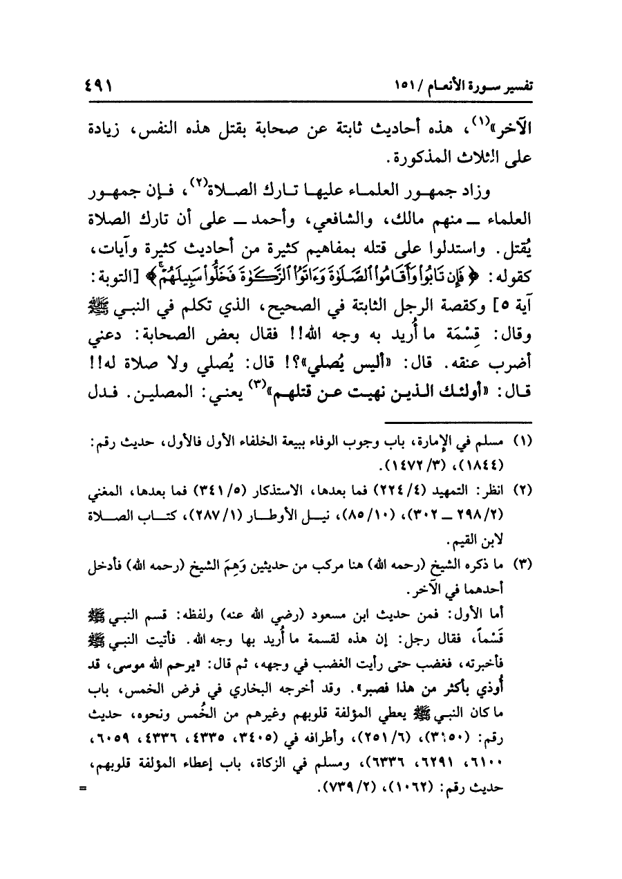 وزَاد جمهور العلماء عليها: تارك الصلاة (¬٢)، فإن جمهور العلماء -منهم مالك، والشافعي، وأحمد- على أنَّ تَارِكَ الصلاة يُقْتَل، واستدلوا على قتله بمفاهيم كثيرة من أحاديث كثيرة وآيات، كقوله: {فَإِن تَابُواْ وَأَقَامُواْ الصَّلَاةَ وَآتَوُاْ الزَّكَاةَ فَخَلُّواْ سَبِيلَهُمْ} [التوبة: آية ٥] وكقصة الرجل الثابتة في الصحيح، الذي تكلم في النبي - صلى الله عليه وسلم - وقال: قِسْمَة ما أُريد به وجْه الله!! فقال بعض الصحابة: دَعْنِي أضرب عنقه. قال: «أَلَيْسَ يُصَلِّي»؟! قال: يُصلي ولا صلاة له!! قال: «أُولَئِكَ الَّذِينَ نُهِيتُ عَنْ قَتْلِهِمْ» (¬٣)