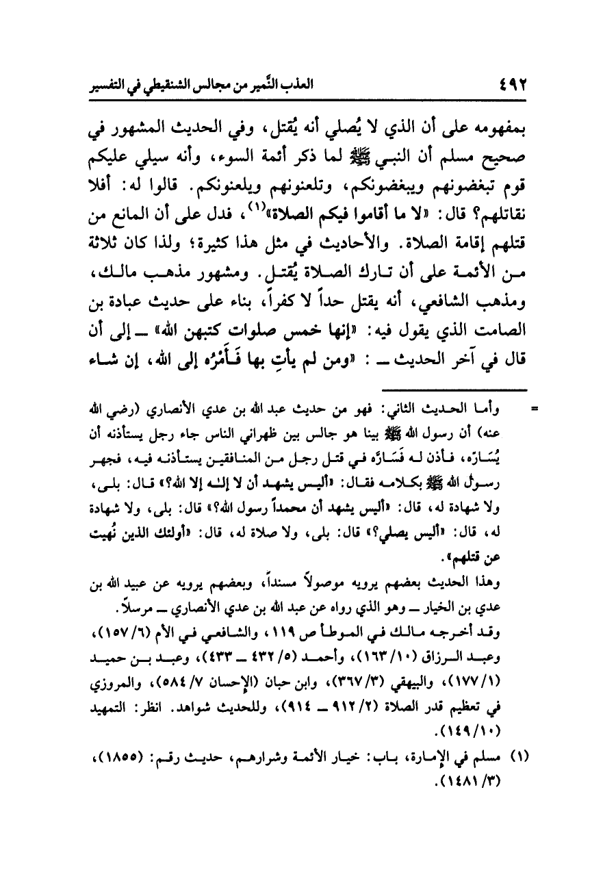 والأحاديث في مثل هذا كثيرة، ولذا كان ثلاثة من الأئمة على أن تارك الصلاة يُقتل، ومشهور مذهب مالك ومذهب الشافعي أنه يقتل حدّاً لا كفراً، بناء على حديث عبادة بن الصامت الذي يقول فيه: «إِنَّهَا خَمْسُ صَلَوَاتٍ كَتَبَهُنَّ اللهُ» -إلى أن قال في آخر الحديث-: «وَمَنْ لَمْ يَأْتِ بِهَا فَأَمْرُهُ إِلَى اللهِ، إِنْ شَاءَ