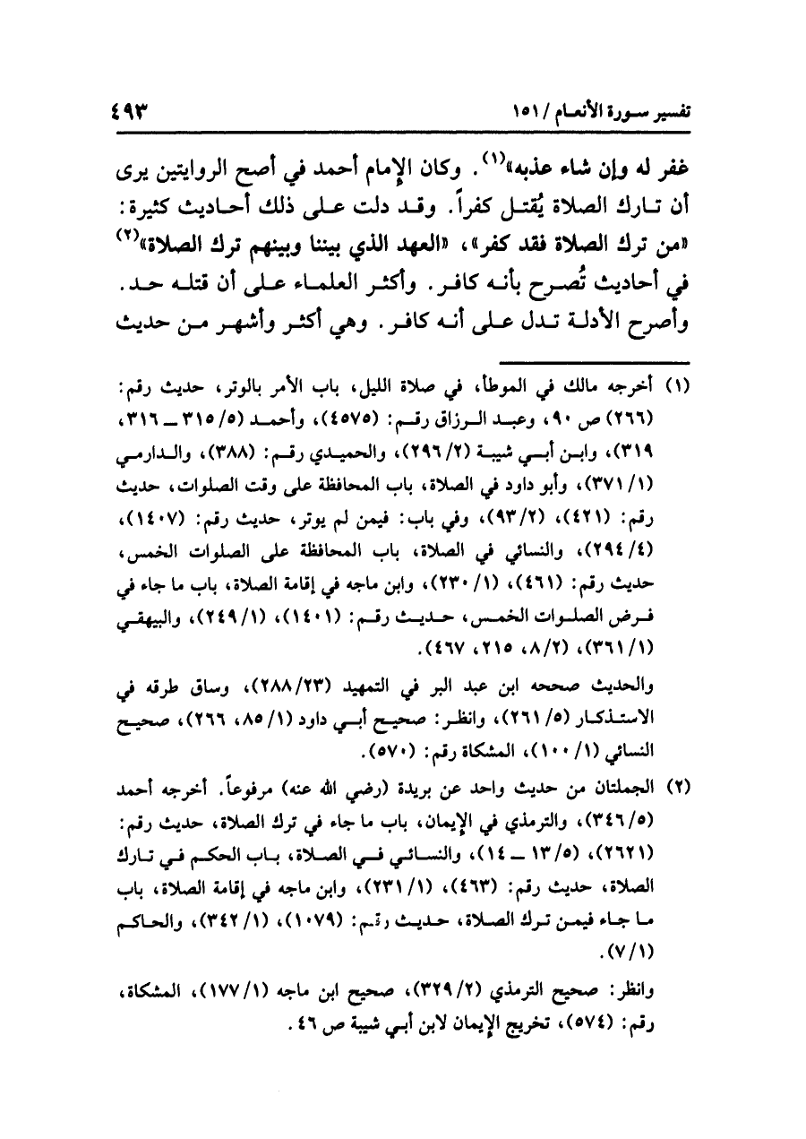 وكان الإمام أحمد في أصَحِّ الروايتين يرى أنَّ تَارِكَ الصلاة يُقْتَلُ كُفْراً (¬٢)، وقَدْ دلَّت على ذلك أحاديث كثيرة: «مَنْ تَرَكَ الصَّلَاةَ فَقَدْ كَفَرَ»، «الْعَهْدُ الَّذِي بَيْنَنَا وَبَيْنَهُمُ تَرْكُ الصَّلَاةِ» (¬٣)