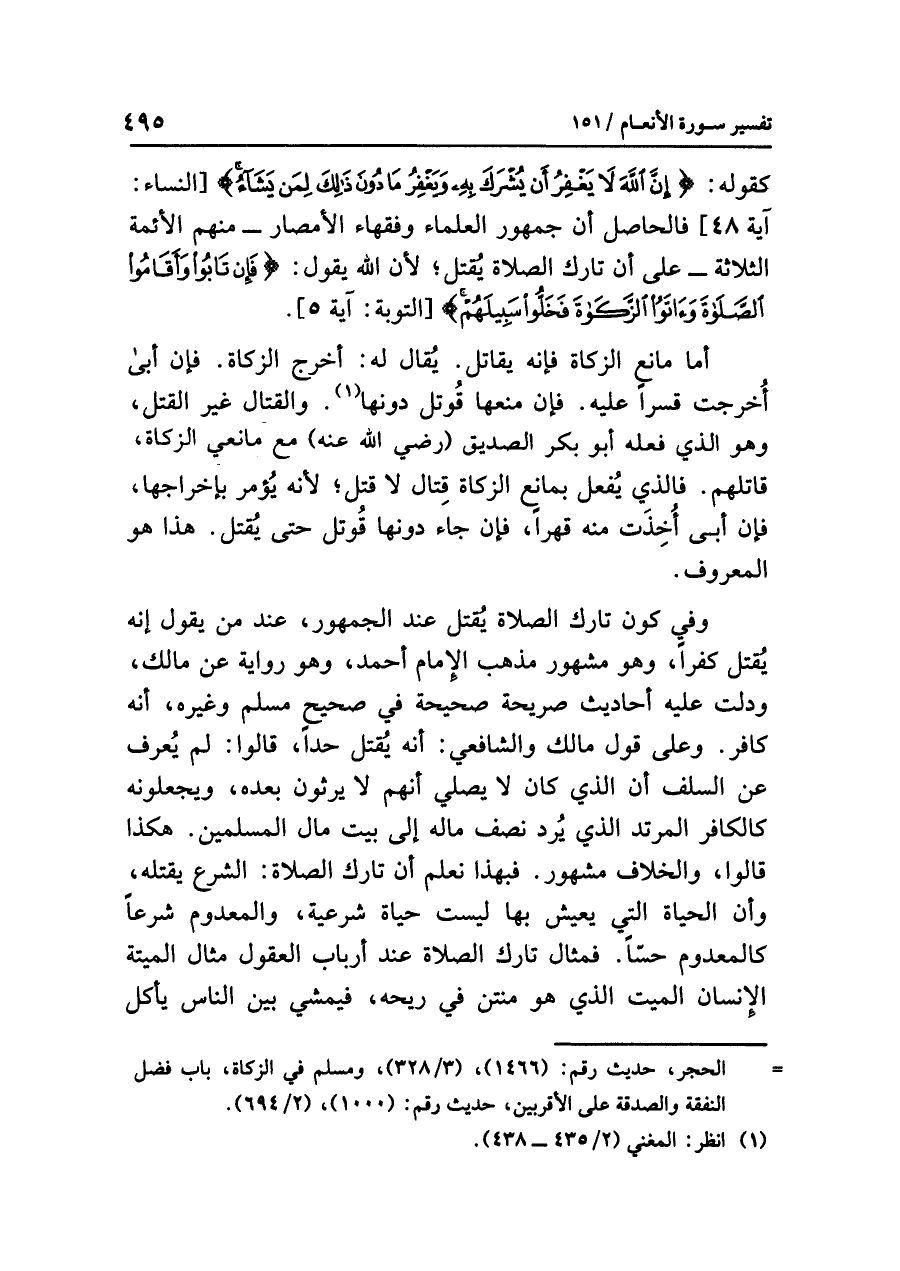 كقوله: {إِنَّ اللهَ لَا يَغْفِرُ أَن يُشْرَكَ بِهِ وَيَغْفِرُ مَا دُونَ ذَلِكَ لِمَن يَشَاءُ} [النساء: آية ٤٨] فالحاصل أن جمهور العلماء وفقهاء الأمصار -منهم الأئمة الثلاثة- على أن تارك الصلاة يُقْتَل؛ لأن الله يقول: {فَإِن تَابُواْ وَأَقَامُواْ الصَّلَاةَ وَآتَوُاْ الزَّكَاةَ فَخَلُّواْ سَبِيلَهُمْ} [التوبة: آية ٥].
