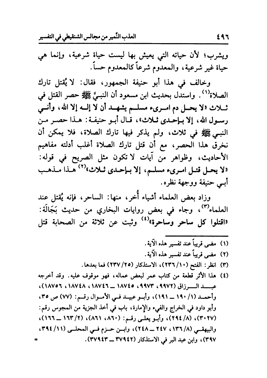 وزاد بعض العلماء أشياء أُخَر، منها: الساحر، فإنه يُقْتَل عند العلماء (¬٣)، وجاء في بعض روايات البخاري من حديث بَجَالَة: «اقْتُلُوا كُلَّ سَاحِرٍ وَسَاحِرَةٍ» (¬٤) وثبت عن ثلاثة مِنَ الصَّحَابَةِ قتل