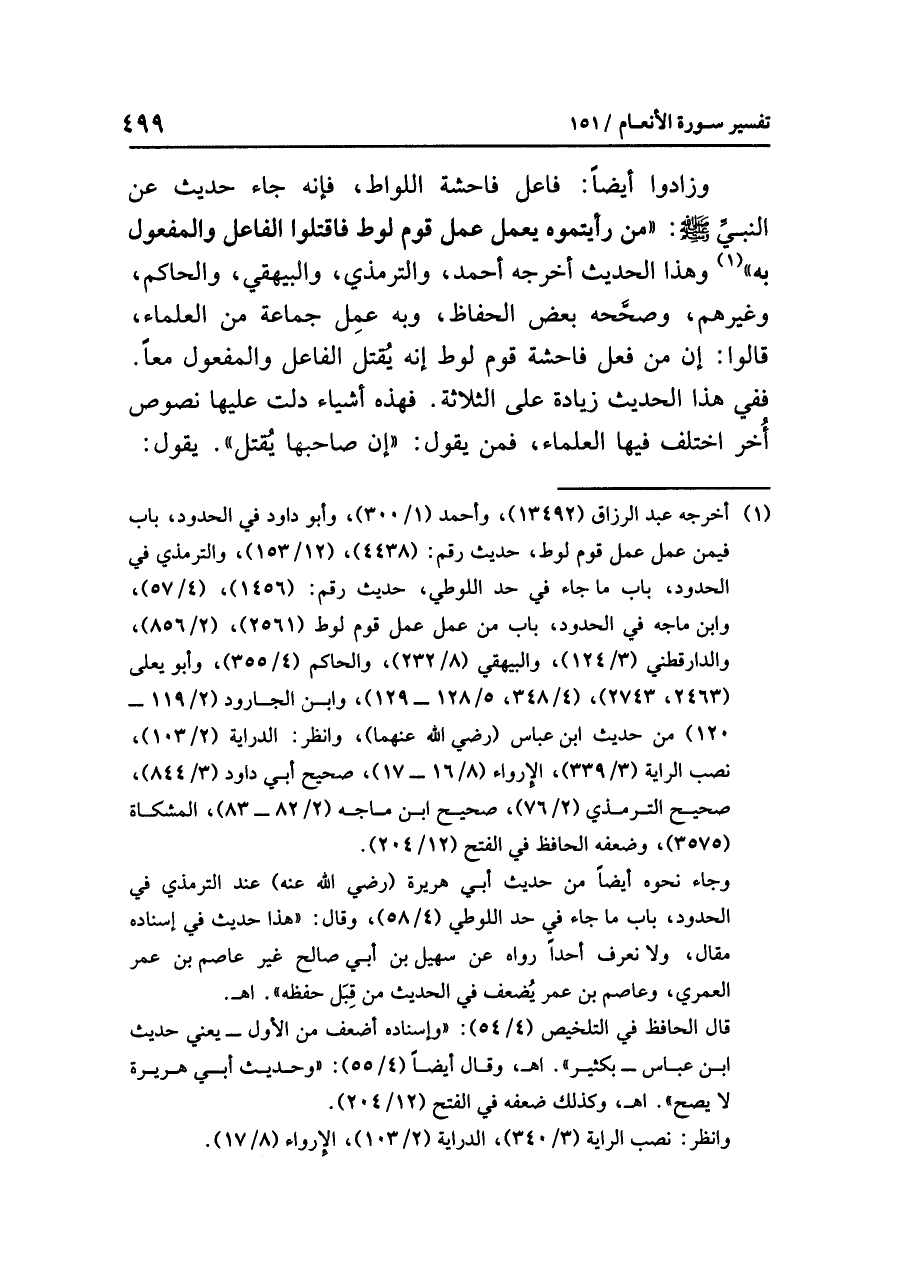 (¬١) أخرجه عبد الرزاق (١٣٤٩٢)، وأحمد (١/ ٣٠٠)، وأبو داود في الحدود، باب فيمن عَمِل عَمَل قوم لوط، حديث رقم: (٤٤٣٨)، (١٢/ ١٥٣)، والترمذي في الحدود، باب ما جاء في حد اللوطي، حديث رقم: (١٤٥٦)، (٤/ ٥٧)، وابن ماجه في الحدود، باب من عَمِلَ عَمَل قوم لوط (٢٥٦١)، (٢/ ٨٥٦)، والدارقطني (٣/ ١٢٤)، والبيهقي (٨/ ٢٣٢)، والحاكم (٤/ ٣٥٥)، وأبو يعلى (٢٤٦٣، ٢٧٤٣)، (٤/ ٣٤٨، ٥/ ١٢٨ - ١٢٩)، وابن الجارود (٢/ ١١٩ - ١٢٠) من حديث ابن عباس (رضي الله عنهما) وانظر: الدراية (٢/ ١٠٣)، نصب الراية (٣/ ٣٣٩)، والإرواء (٨/ ١٦ - ١٧)، صحيح أبي داود (٣/ ٨٤٤)، صحيح الترمذي (٢/ ٧٦)، صحيح ابن ماجه (٢/ ٨٢ - ٨٣)، المشكاة (٣٥٧٥)، وضعفه الحافظ في الفتح (١٢/ ٢٠٤).