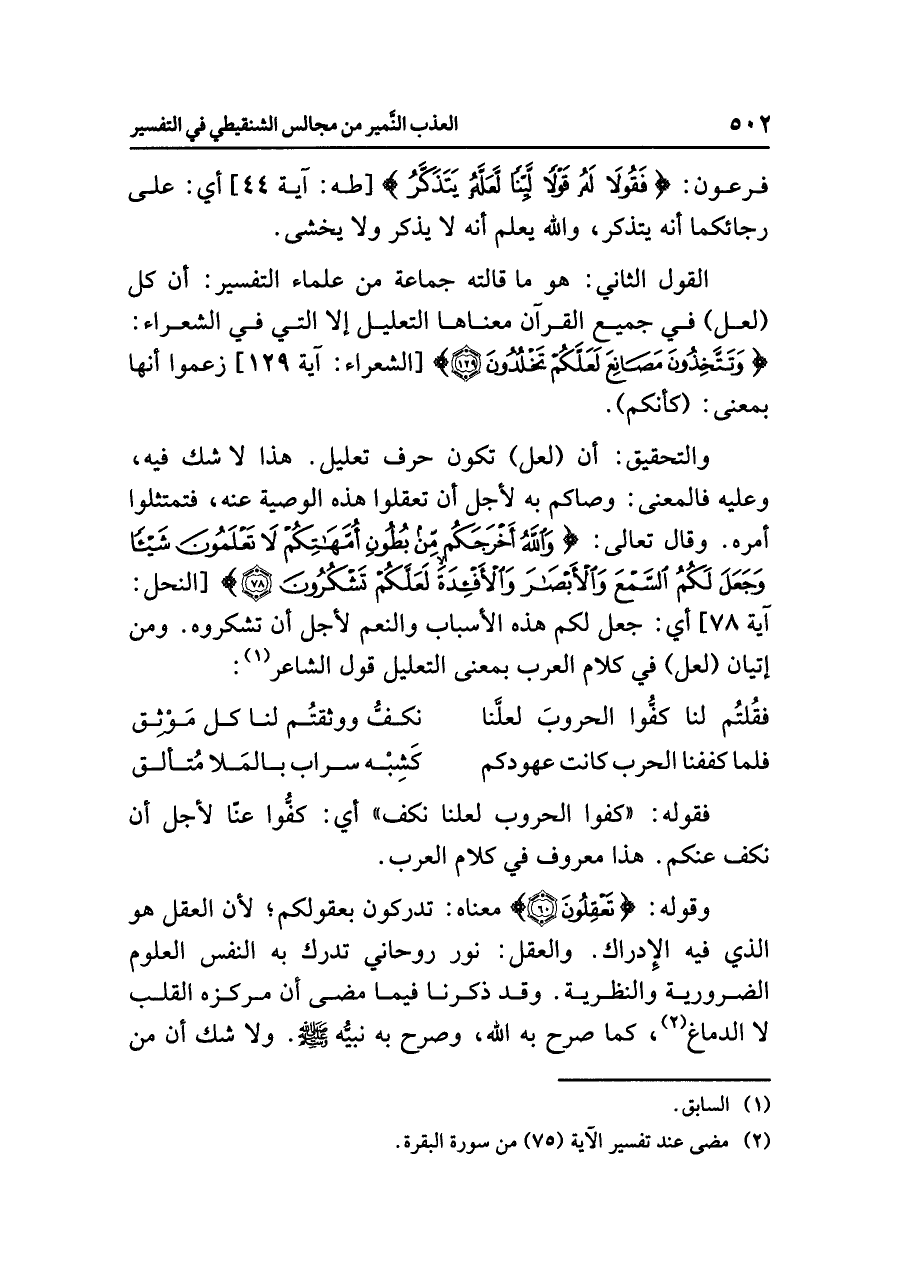 القول الثاني: هو ما قالته جماعة من علماء التفسير: أن كل (لعل) في جميع القرآن معناها التعليل إلا التي في الشعراء: {وَتَتَّخِذُونَ مَصَانِعَ لَعَلَّكُمْ تَخْلُدُونَ} [الشعراء: آية ١٢٩] زعموا أنها بمعنى: (كأنكم).