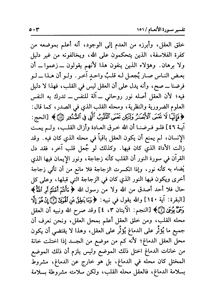 خَلَق العقل وأبْرَزَهُ مِنَ العدم إلى الوجود، أنه أعلم بموضعه من كَفَرَةِ الفَلَاسِفَة الذين يَتَحَكَّمُون على الله ويخالفونه من غير دليل ولا برهان، وهؤلاء الذين ينفون هذا؛ لأنهم يقولون -زعموا- أن بعض الناس صار يُجعل له قلبُ واحدٍ آخر، ولو أن هذا -لو فرضنا- صح، وأنه يدل على أن العقل ليس في القلب، فهذا لا دليل فيه؛ لأن العقل أصله نور روحاني -آلة للنفس- تُدْرِكُ بِهِ النَّفْسُ العُلُومَ الضَّرُورِيَّة والنظرية، ومحله القلب الذي في الصدر، كما قال: {فَإِنَّهَا لَا تَعْمَى الْأَبْصَارُ وَلَكِن تَعْمَى الْقُلُوبُ الَّتِي فِي الصُّدُورِ} [الحج: آية ٤٦] فَلَوْ فرضنا أن الله خرق العادة وأزال القلب، ولم يمت الإنسان، لم يمنع أن يكون العقل باقياً في محله الذي كان فيه، وقد زالت الأداة الذي كان فيها.