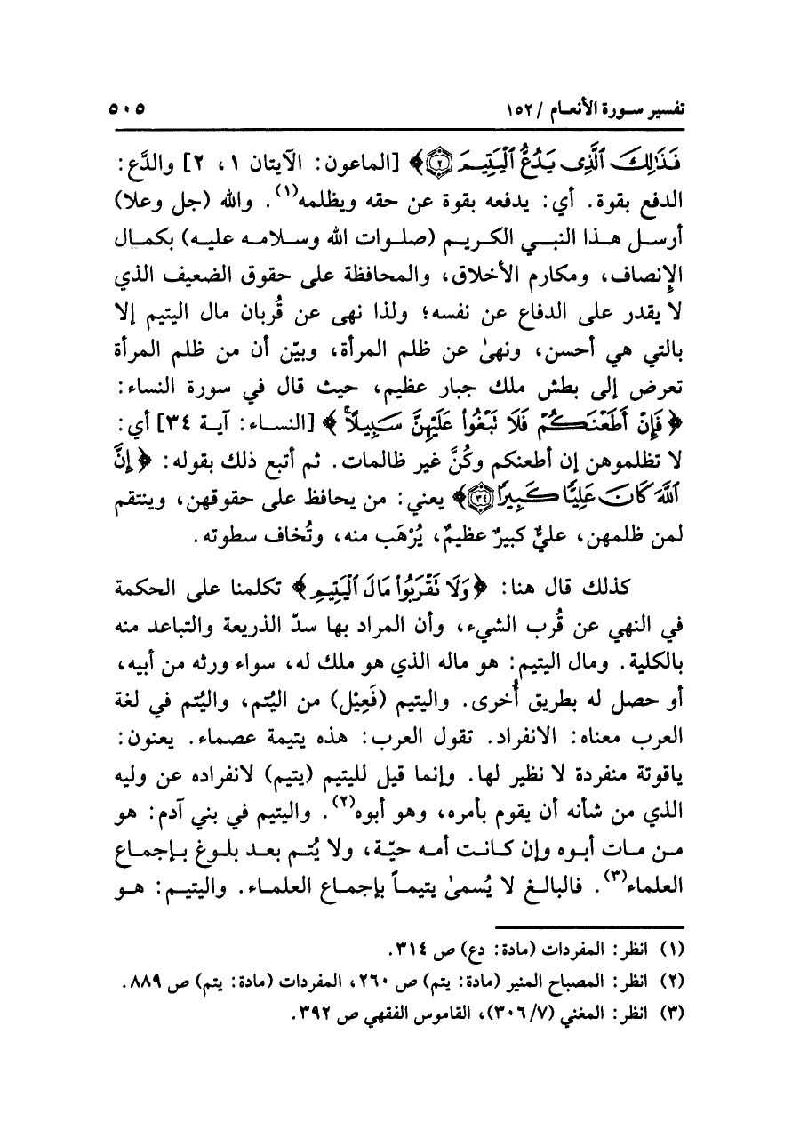 كذلك قال هنا: {وَلَا تَقْرَبُواْ مَالَ الْيَتِيمِ} تكلمنا على الحكمة في النهي عن قُرب الشيء، وأن المراد بها سدّ الذريعة والتباعد منه بالكلية، ومال اليتيم: هو ماله الذي هو ملك له، سواء ورثه من أبيه، أو حصل له بطريق أُخرى، واليتيم (فَعِيْل) من اليُتم، واليُتم في لغة العرب معناه: الانفراد، تقول العرب: هذه يتيمة عصماء، يعنون: ياقوتة منفردة لا نظير لها، وإنما قيل لليتيم (يتيم) لانفراده عن وَلِيِّهِ الذي من شأنه أن يَقُومَ بِأَمْرِهِ وهو أبوه (¬٢). واليتيم في بني آدم: هو مَنْ مَاتَ أبوه وإن كانت أمه حيّة، ولا يُتم بعد بلوغ بإجماع العلماء (¬٣)، فالبالغ لا يُسمَّى يتيماً بإجماع العلماء. واليتيم: هو