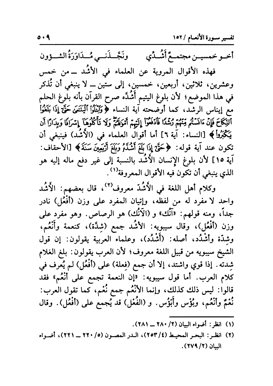 فهذه الأقوال المرْوِيَّة عن العلماء في الأشُد -من خمس وعشرين، ثلاثين، أربعين، خمسين، إلى ستين- لا ينبغي أن تُذْكَرَ في هذا الموضع؛ لأن بلوغ اليتيم أَشُدَّه صرح القرآن بأنه بُلُوغُ الحُلُمِ مَعَ إيناس الرّشد، كما أوضحته آية النساء {وَابْتَلُواْ الْيَتَامَى حَتَّىَ إِذَا بَلَغُواْ النِّكَاحَ فَإِنْ آنَسْتُم مِّنْهُمْ رُشْداً فَادْفَعُواْ إِلَيْهِمْ أَمْوَالَهُمْ وَلَا تَأْكُلُوهَا إِسْرَافاً وَبِدَاراً أَن يَكْبَرُواْ} [النساء: آية ٦] أما أقوال العلماء في (الأَشُد) فينبغي أن تكون عند آية قوله: {حَتَّى إِذَا بَلَغَ أَشُدَّهُ وَبَلَغَ أَرْبَعِينَ سَنَةً} [الأحقاف: آية ١٥] لأن بلوغ الإنسان الأَشُد بالنسبة إلى غير دفع ماله إليه هو الذي ينبغي أن تكون فيه الأقوال المعروفة (¬١).