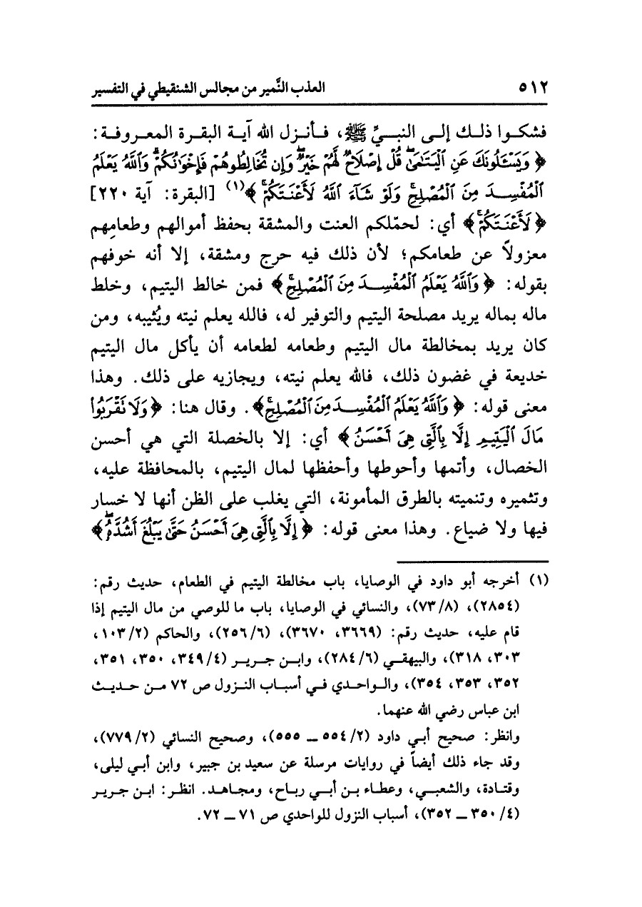 (¬١) أخرجه أبو داود في الوصايا، باب مخالطة اليتيم في الطعام، حديث رقم: (٢٨٥٤)، (٨/ ٧٣) والنسائي في الوصايا، باب ما للوصي من مال اليتيم إذا قام عليه، حديث رقم: (٣٦٦٩، ٣٦٧٠)، (٦/ ٢٥٦)، والحاكم (٢/ ١٠٣، ٣٠٣، ٣١٨)، والبيهقي (٦/ ٢٨٤)، وابن جرير (٤/ ٣٤٩، ٣٥٠، ٣٥١، ٣٥٢، ٣٥٣، ٣٥٤)، والواحدي في أسباب النزول ص (٧٢) من حديث ابن عباس رضي الله عنهما.