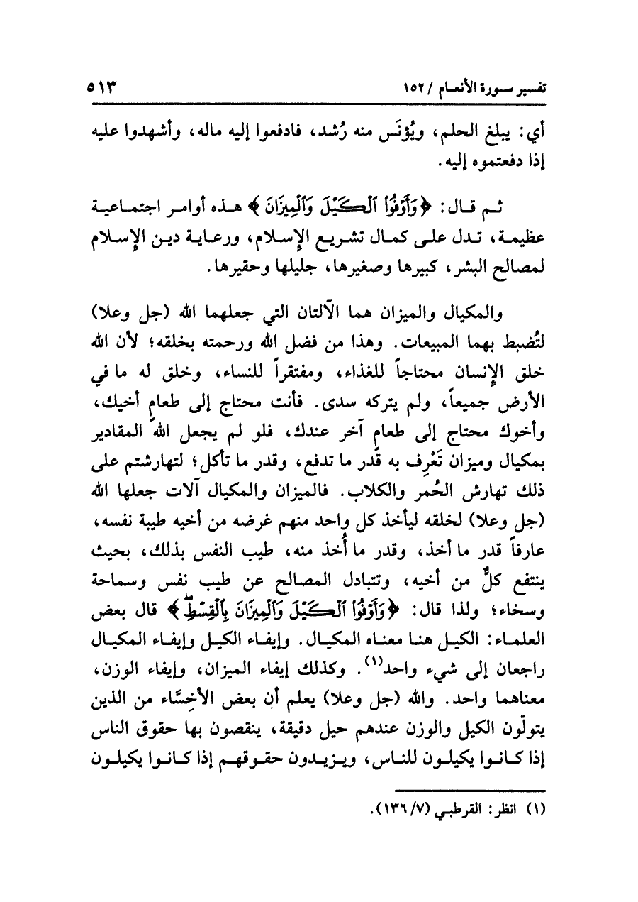 ثم قال: {وَأَوْفُواْ الْكَيْلَ وَالْمِيزَانَ} هذه أوامر اجتماعية عظيمة، تدل على كمال تشريع الإسلام، ورعاية دين الإسلام لمصالح البشر، كبيرها وصغيرها، جليلها وحقيرها.